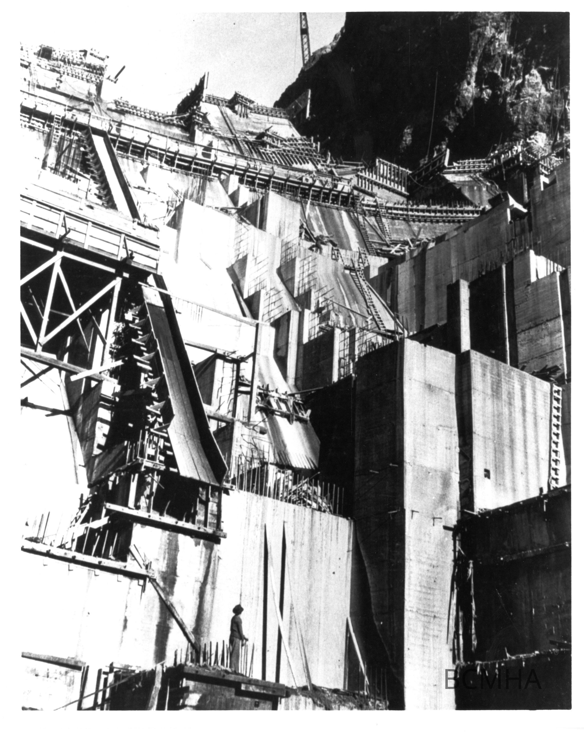 AZ. side of downstream face of the dam. View shows power plant footings & foundation. Copy neg.; Ben D. Glaha, photographer; USBR photo/ Wash. no. 2271/ Temp. no. 1787Made/Created