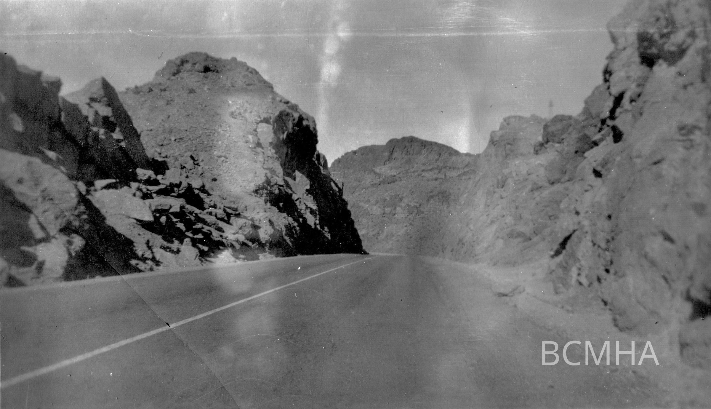 Hoover Dam construction general view, c. 1935 [U. S. 93 Highway] "Road leading to the dam passing through the mts."Collection