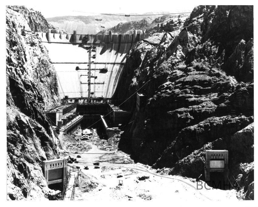 General view looking upstream through Black Canyon from point on construction road to lower portals. Downstream face of the dam, power plant & 3 tunnel outlet portals are seen; Ben D. Glaha; USBR photo/ BCP 03252Made/Created