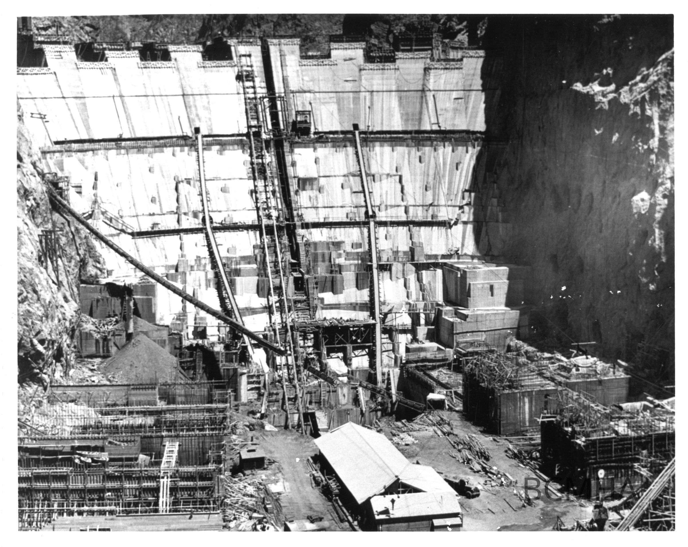 Boulder Canyon Project, NV. Hoover Damsite Region 3 Downstream face of dam & power plant construction as seen from NV. canyon wall outlet works site April 26, 1934; Ben D. Glaha; USBR photo/ BCP2427AMade/Created