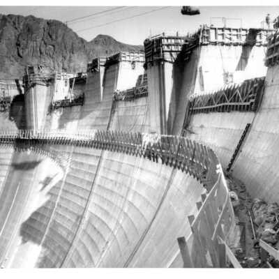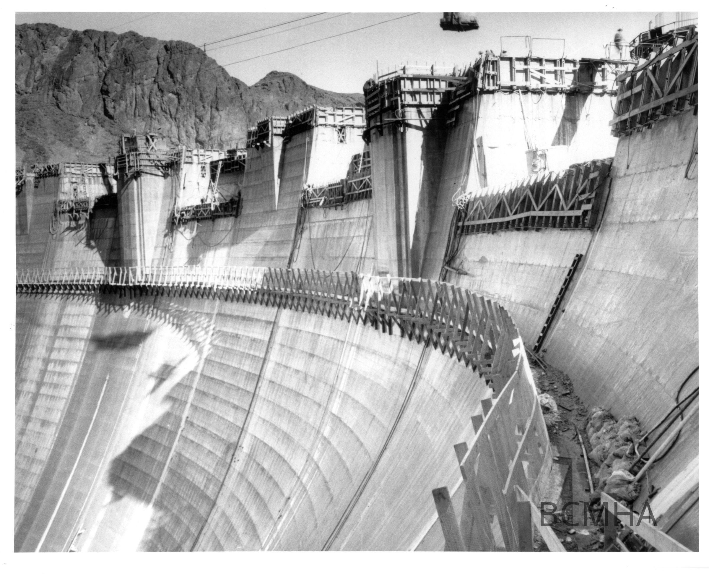 Looking across the downstream face of Boulder Dam showing the utility towers & elevator shaft; BCL-Williams A. Bechtel album 3 photo no. 3038Made/Created