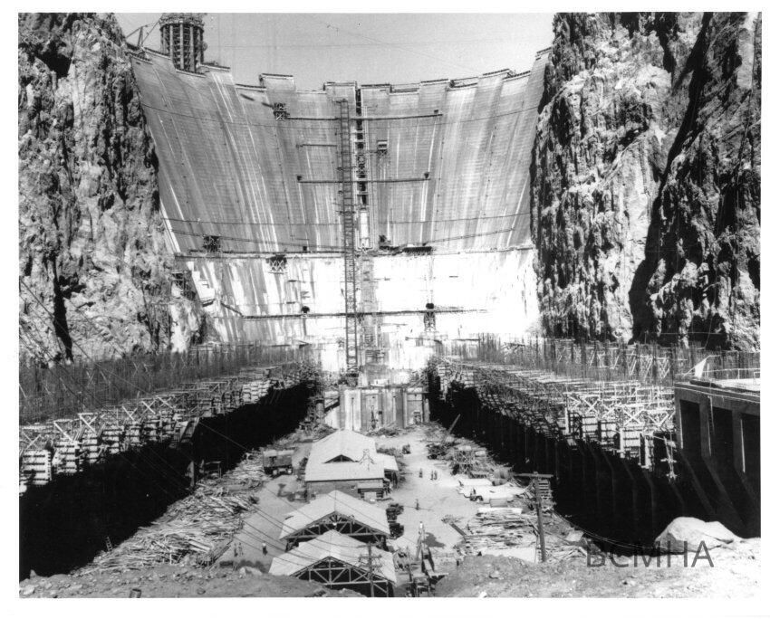Looking upstream at Boulder Dam & the Powerhouse from the downstream cofferdam; BCC- William A. Bechtel album 3, photo no. 2847Made/Created