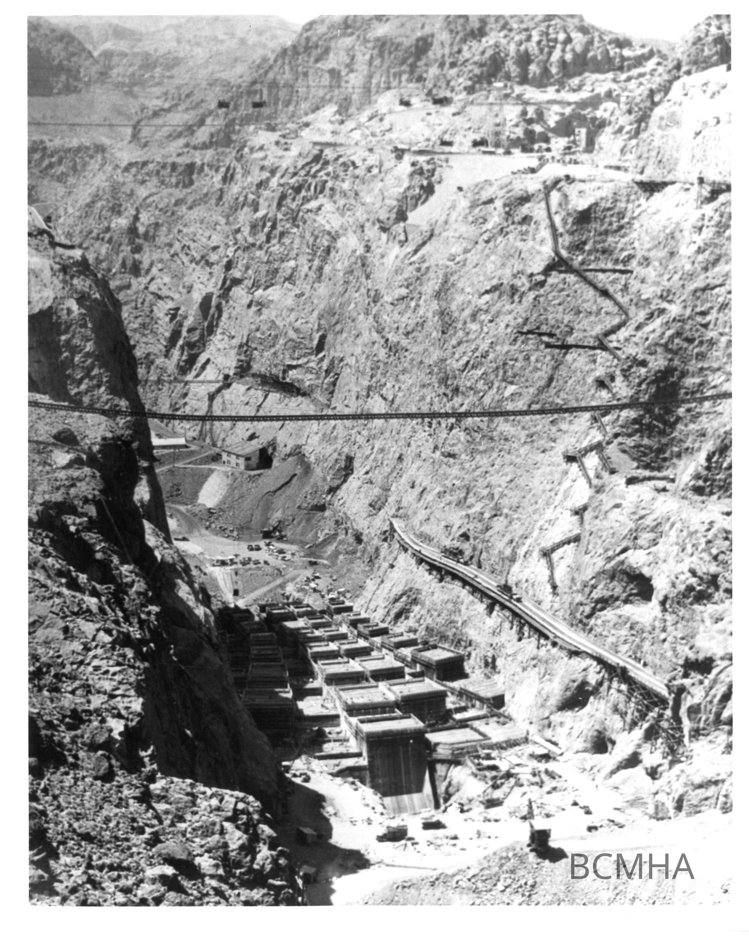 BCP 1954A Boulder Canyon Project, NV. Hoover Damsite Reg. 3 Damsite & structure as seen from point on AZ. Canyon rim roughly defined by coordinate point N 3100 W 48000. View looks downstream; Ben D. Glaha, photographer; USBR photo/ BCP 1954AMade/Created