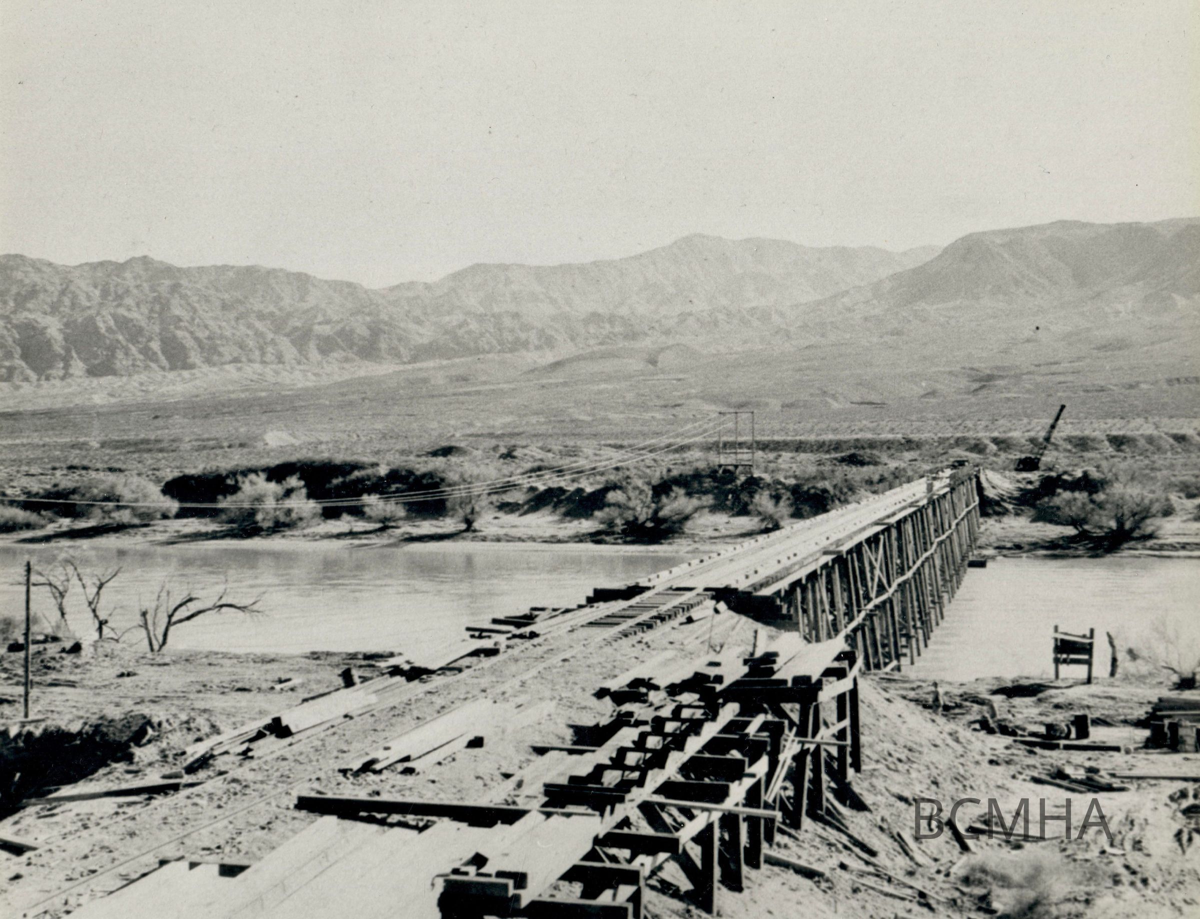 Hoover Dam construction: "Graphic Views of Hoover Dam Six Companies, in order to have access by rail to the Arizona gravel pits, constructed a pile bridge across the Colorado River just above Hesse's Camp (?) Circa Mid-1931."; Photo #95 by W. A. Davis; Roll 12 - Photo No. 8 Copy Negative - Bureau of ReclamationCollection