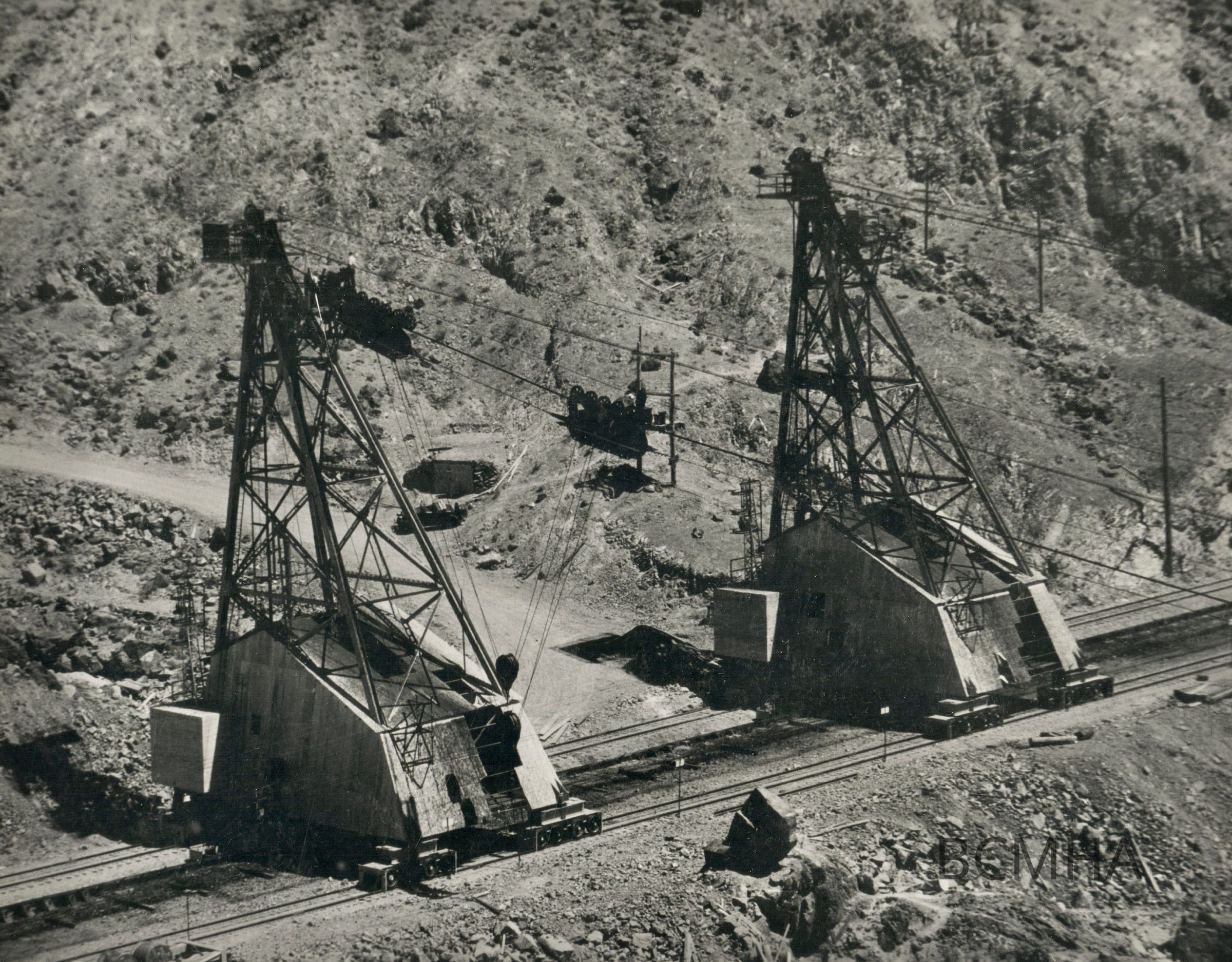 Hoover Dam - construction: cableways: "Head towers of Six Companies Inc. cableways Nos. 5 and 6. June 23, 1933."; photo by B. D. Glaha; USBR Wash. No. 01812Collection