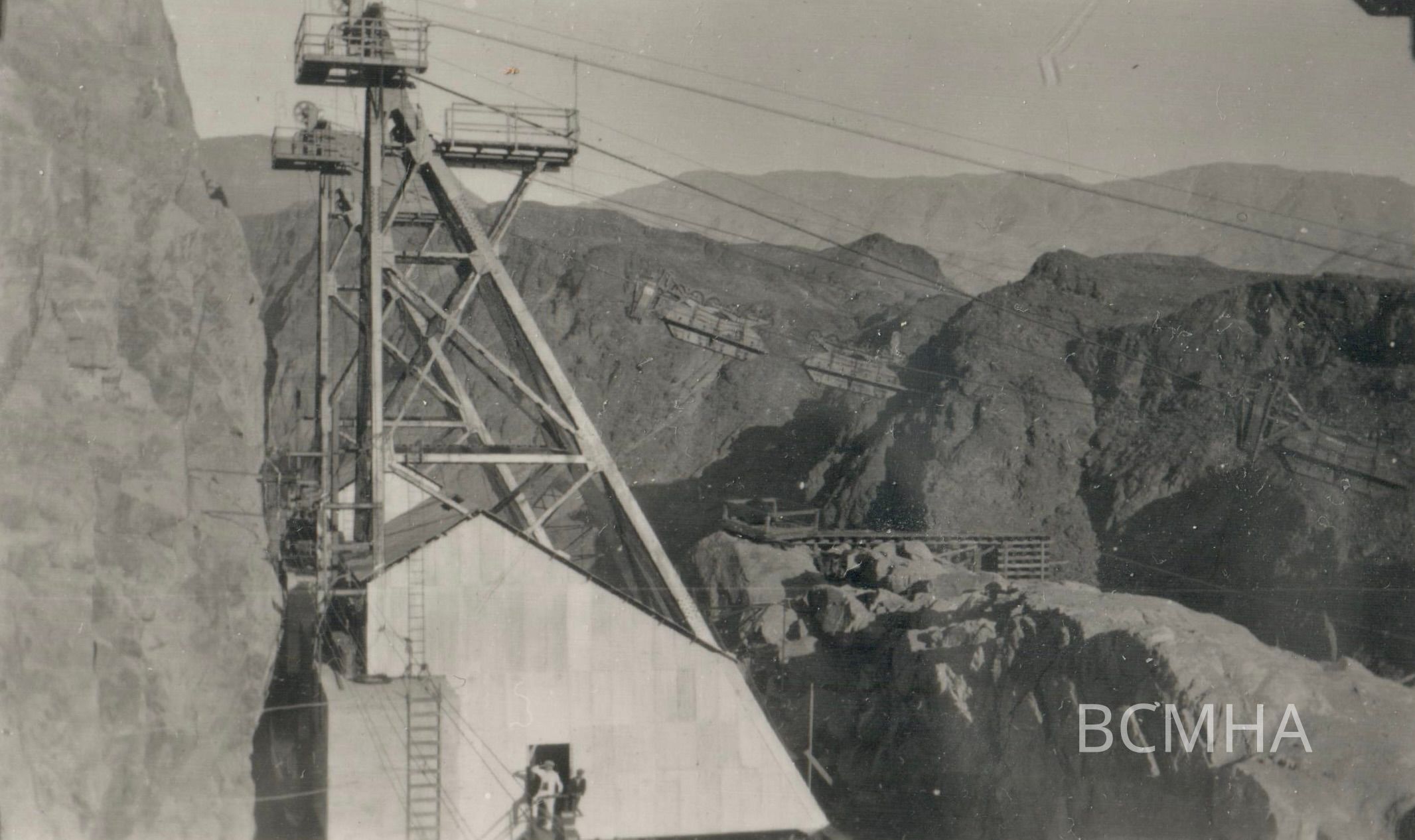 Hoover Dam construction: "High Scalers at work - Boulder Dam '32. High line cable."; UNLS - Wieking Collection 76-64-70 cnCollection