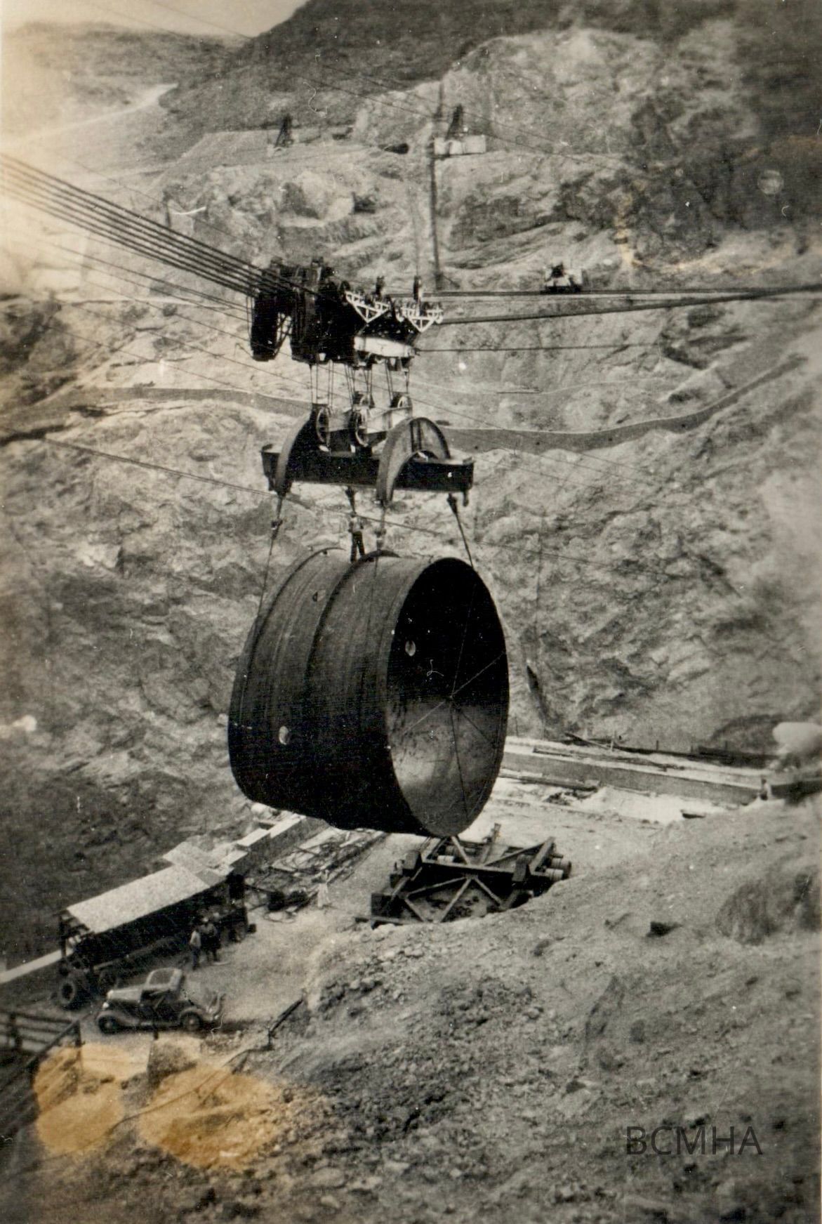 Hoover Dam - construction: penstocks hauling, c. 1934, Moving a penstock by cablewayCollection