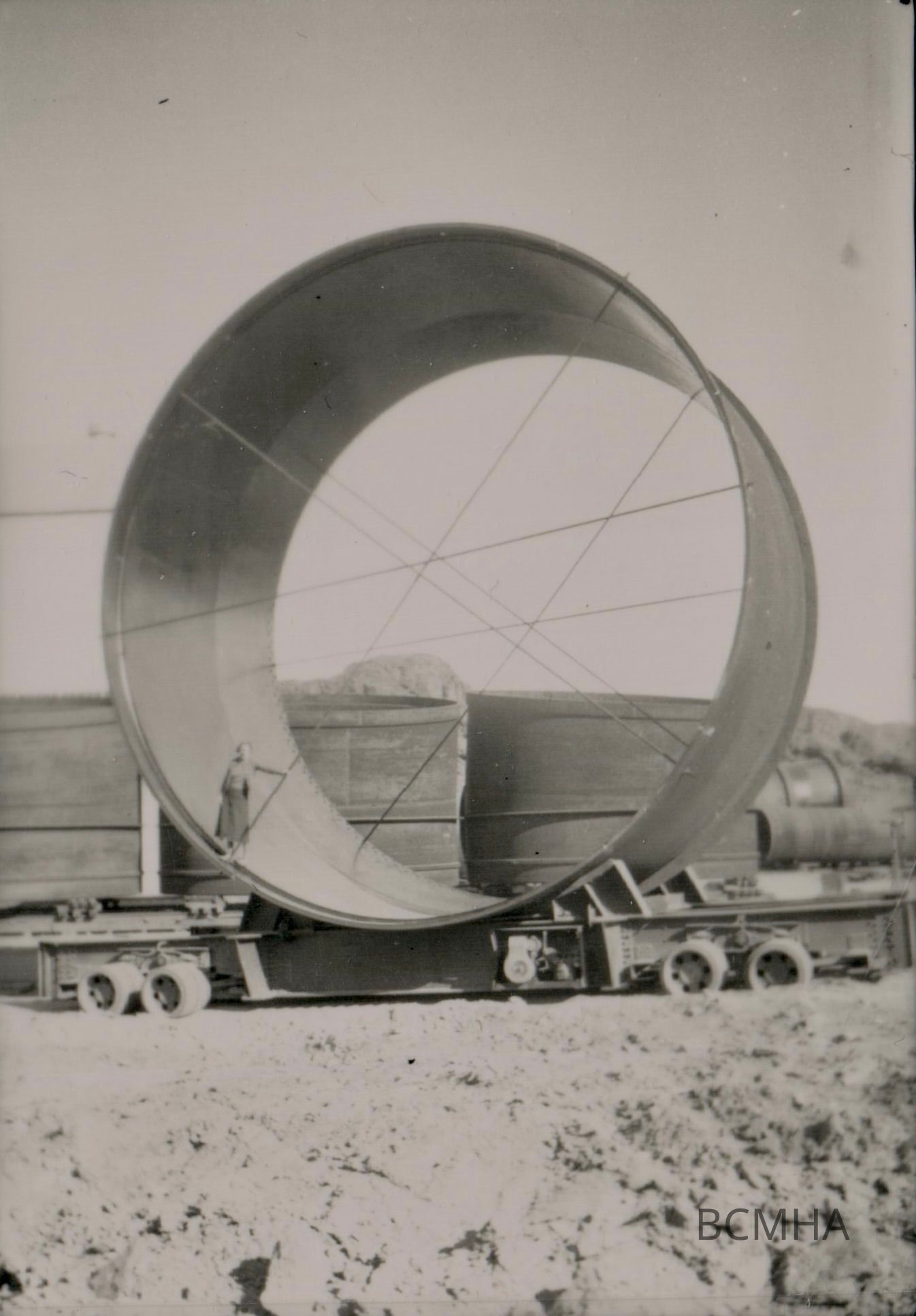 Hoover Dam construction: penstocks: Babcock and Wilcox Co. steel fabricating plant near the Hoover damsite where the penstocks were manufactured [hauled], c. 1934; 30 ft. penstock pipe section on trailer ready to move; Dean Pulsipher; TF; unidentified woman posed in sectionCollection