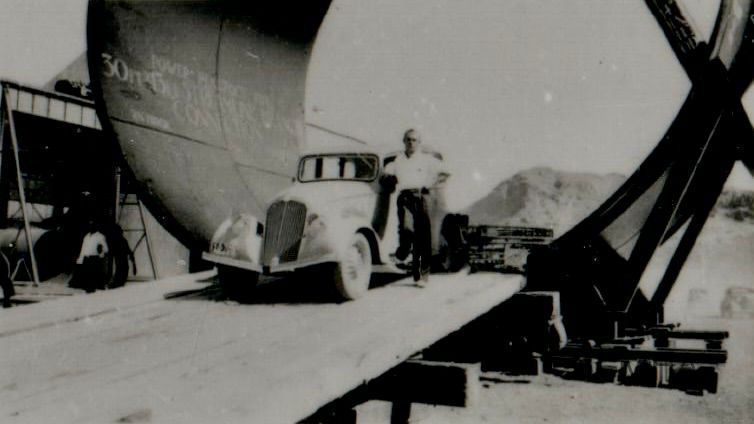 Hoover Dam construction: penstocks: people and vehicles posed, September 30, 1935; Mike Stepko (?), foreman for Eichleag Engineering, the sub-contractor in charge of hauling the penstock pipe to the damsite; this section of 30-foot penstock pipe was set up for President Franklin Roosevelt's car to drive through when he dedicated the dam; Dean Pulsipher photoCollection