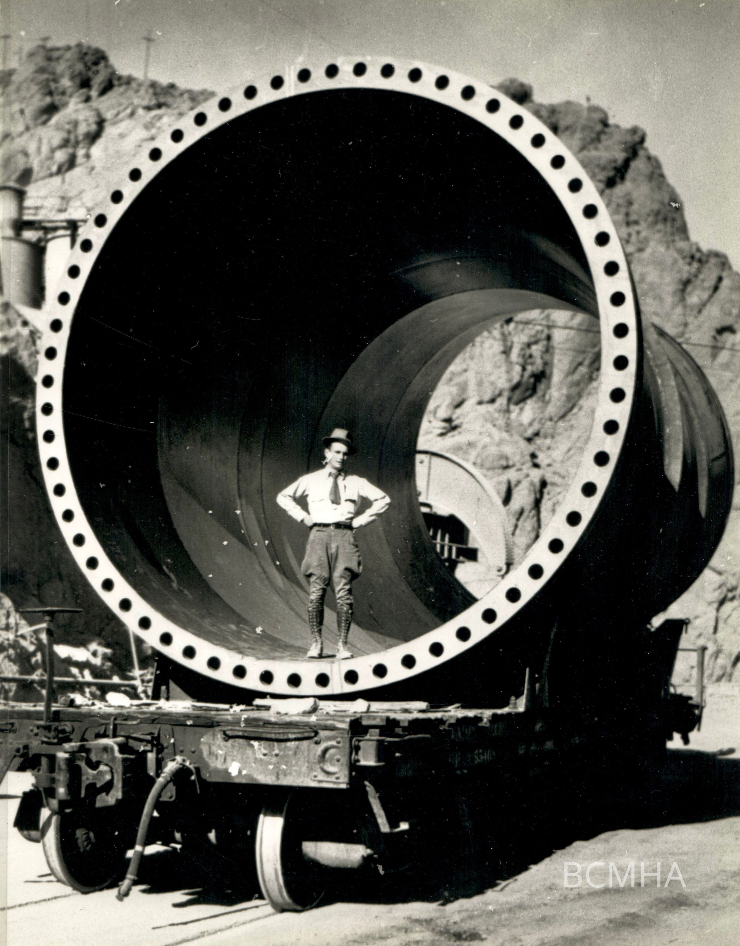 Hoover Dam construction: penstocks: "Boulder Dam - Big Pipe - Babcock and Wilcox Plant. 13-foot diameter penstock pipe." [Unidentified man]; 0100 0426 neg. folder 100-17 Manis Collection; UNLV Library - Special Collections Copy Negative; USBR photoCollection