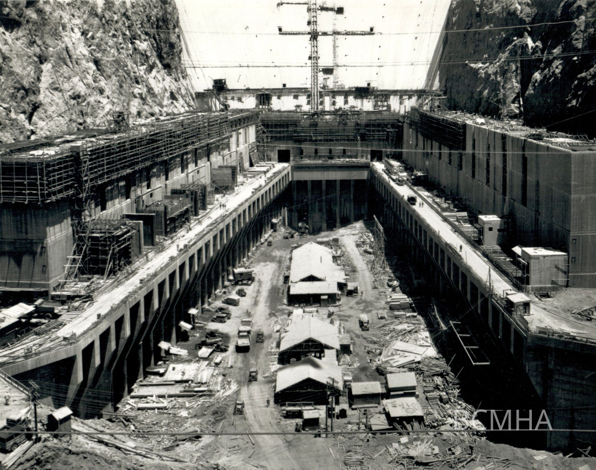 Hoover Dam construction: power generation: "View taken from the Valve House catwalk, looking upstream toward the Power House." June 24, 1935; USBR photo/BCP 3318Collection
