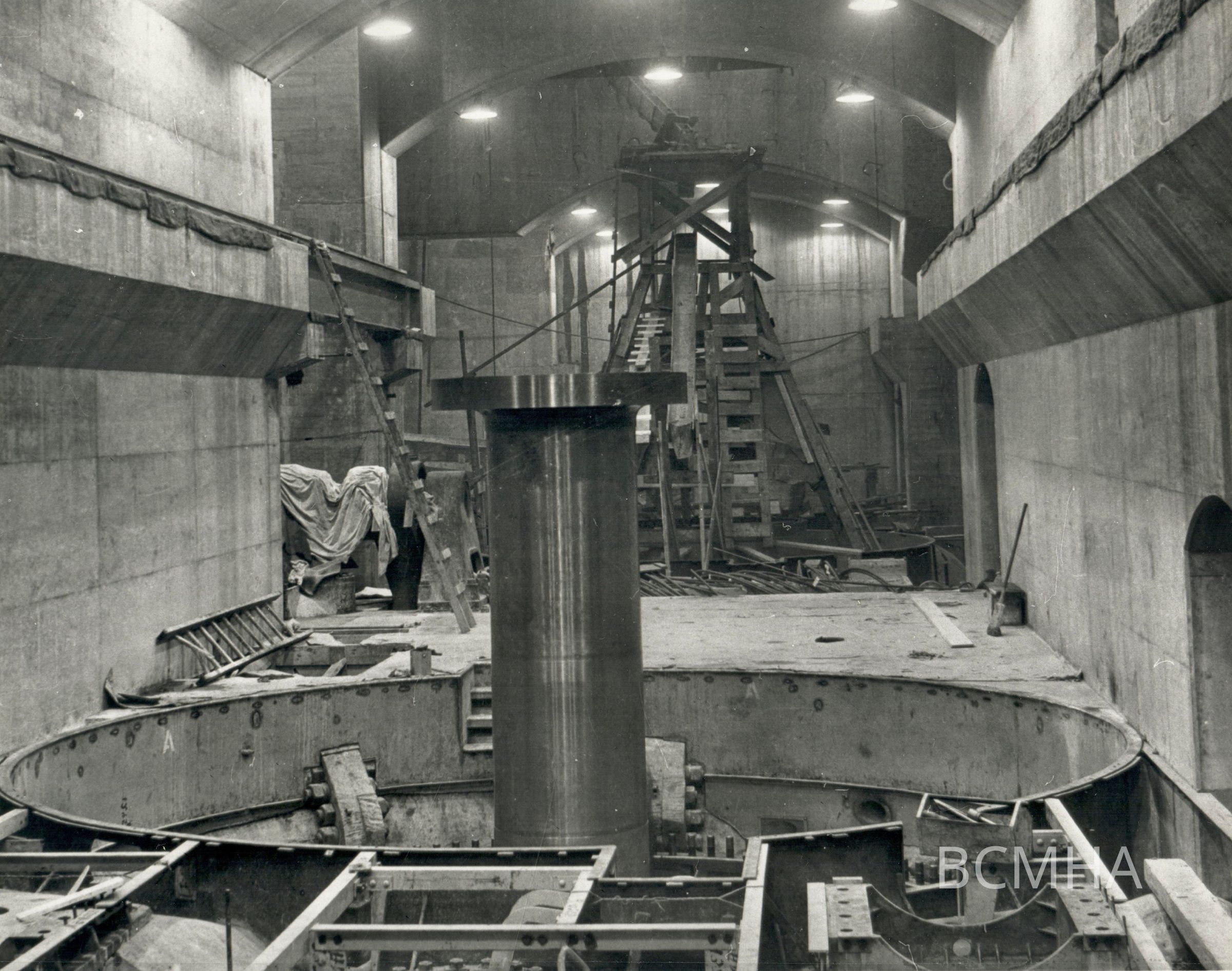 Hoover Dam construction: power generation: "View looking upstream in the Nevada turbine gallery. The runner for turbine N-2 has been placed and the wicket gates are about to be set." 7/10/36; G. L. Ullom, photographer; USBR photo/Wash. No 03553/Temp. No. 02906; UNLV Library - Special Collections Copy NegativeCollection