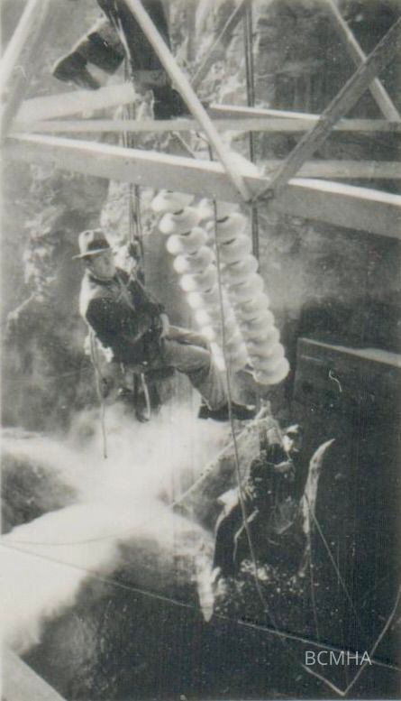 Hoover Dam - construction: power generation: transmission lines, c. 1936-37: Installing power lines from the top of the canyon to the Arizona power house roof; Phil Lawson is the man at the top near the insulators; man at bottom is unidentified; Dean Pulsipher photoCollection