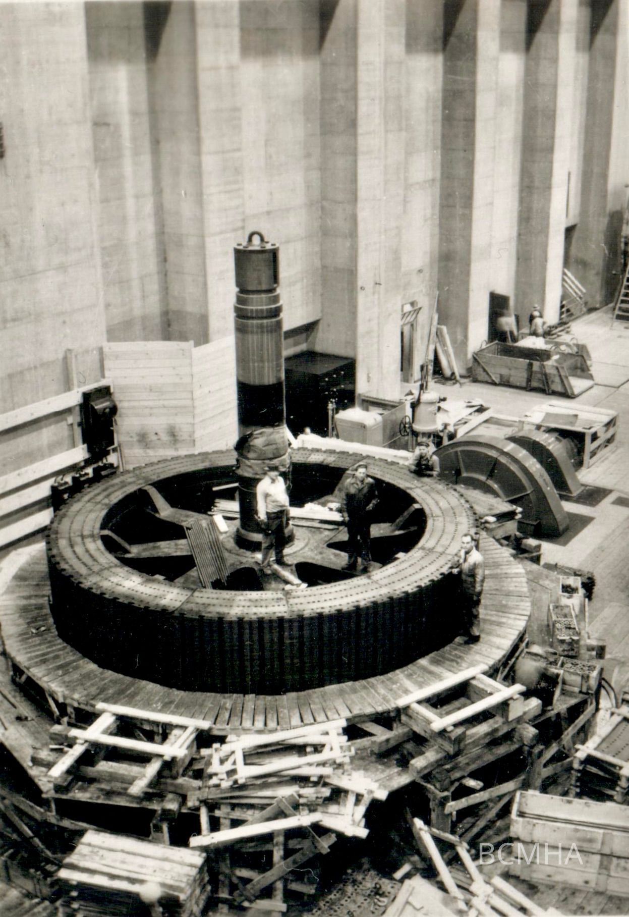Hoover Dam construction: power generation: generator rotor (the plates stacked around are called laminations, and will be attached to the rotor), c. 1935 [men pictured: Graves; Hallman; Berry; Forbes]Collection