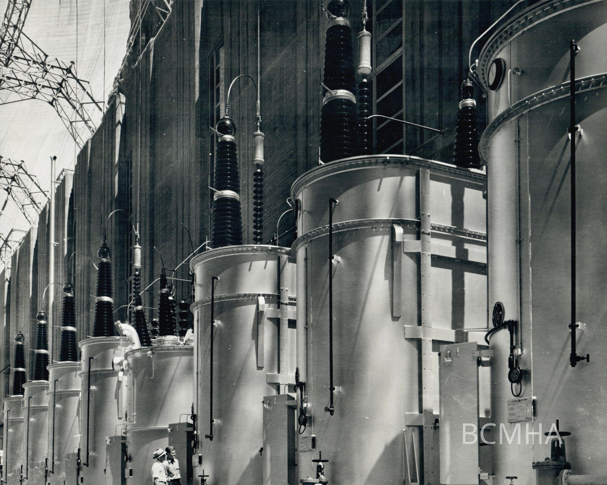 Hoover Dam construction: power generation: "View of bank of 287.5 kV transformers along the ramp of the Arizona Powerplant." April 1941; B. D. Glaha, photographer; Bureau of Reclamation photo/BCP 5391 A; 3CCollection