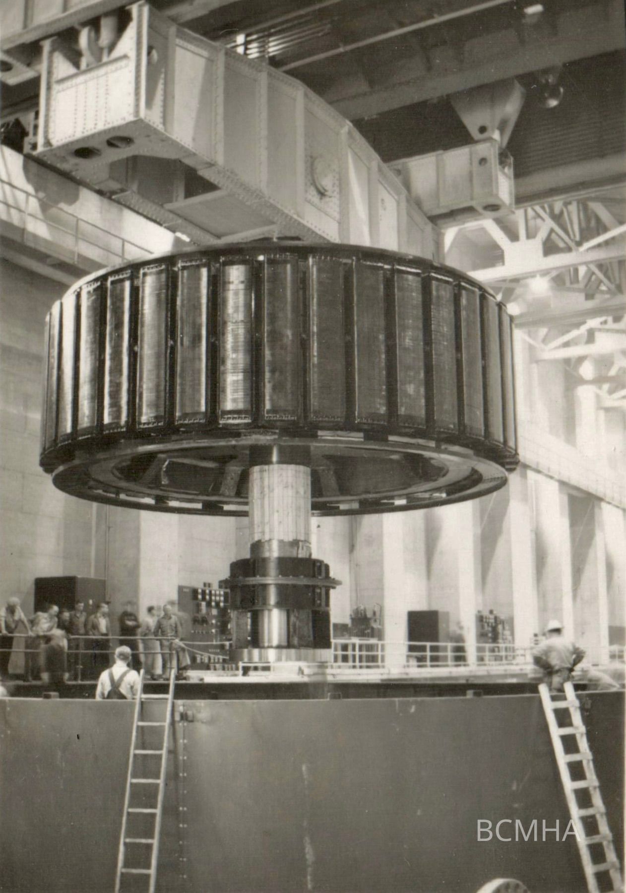 Hoover Dam construction: power generation: assembling the main power generating units, c. 1935-37: Lowering the 500-ton rotating field into the stator.Collection