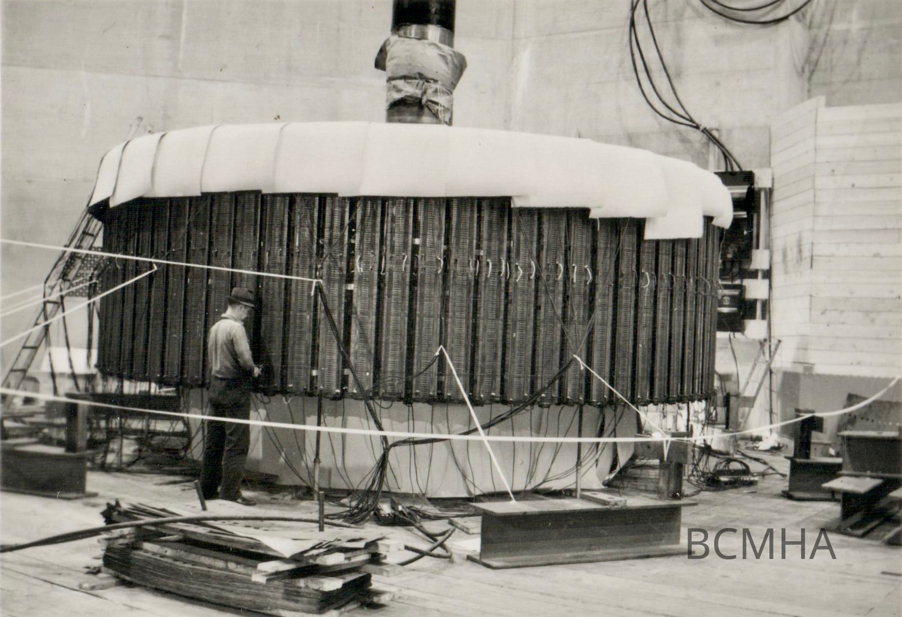 Hoover Dam construction: power generation: generator rotor (the plates stacked around are called laminations, and will be attached to the rotor), c. 1935; man pictured is Mr. WebbCollection