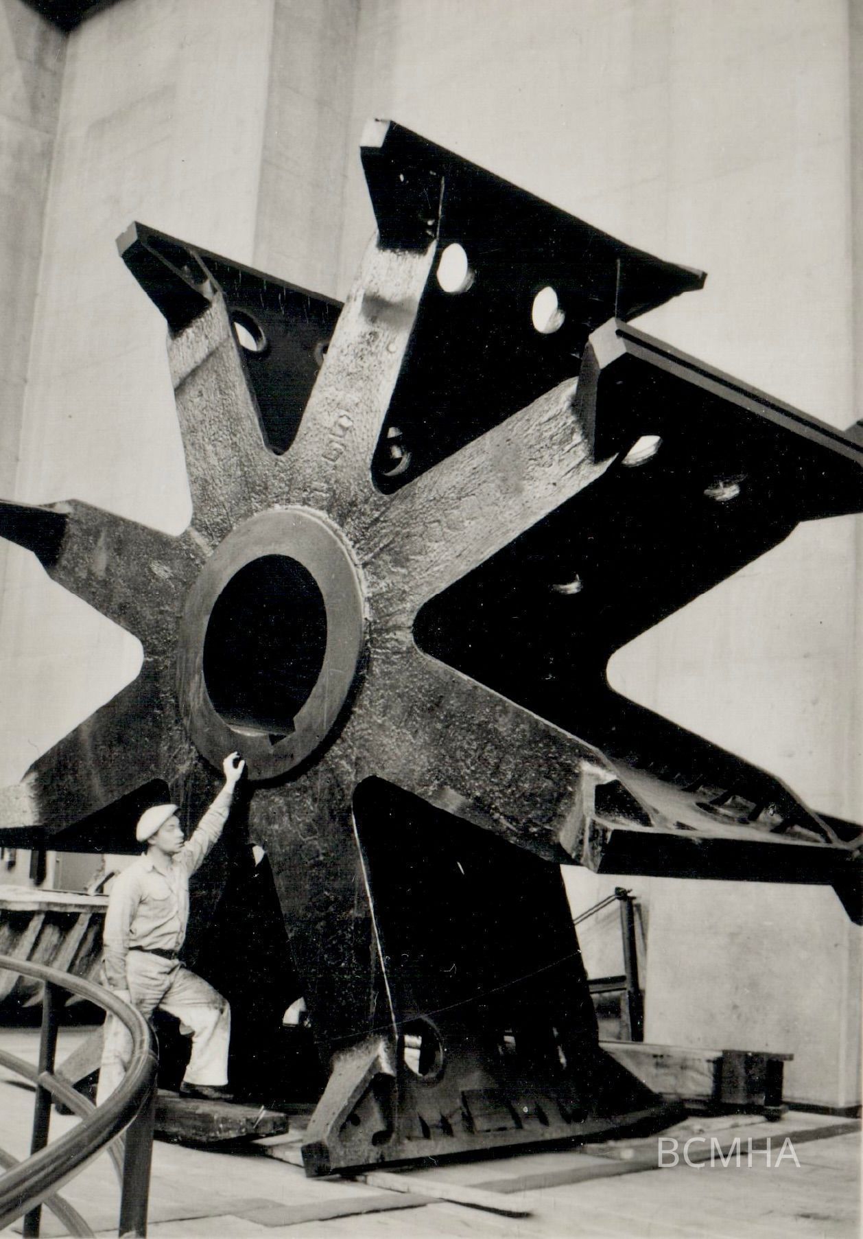 Hoover Dam construction: power generation: Interior support/framework for the generator rotor (the plates stacked around are called laminations, and will be attached to the rotor), c. 1935; man in picture is Mr. ColemanCollection