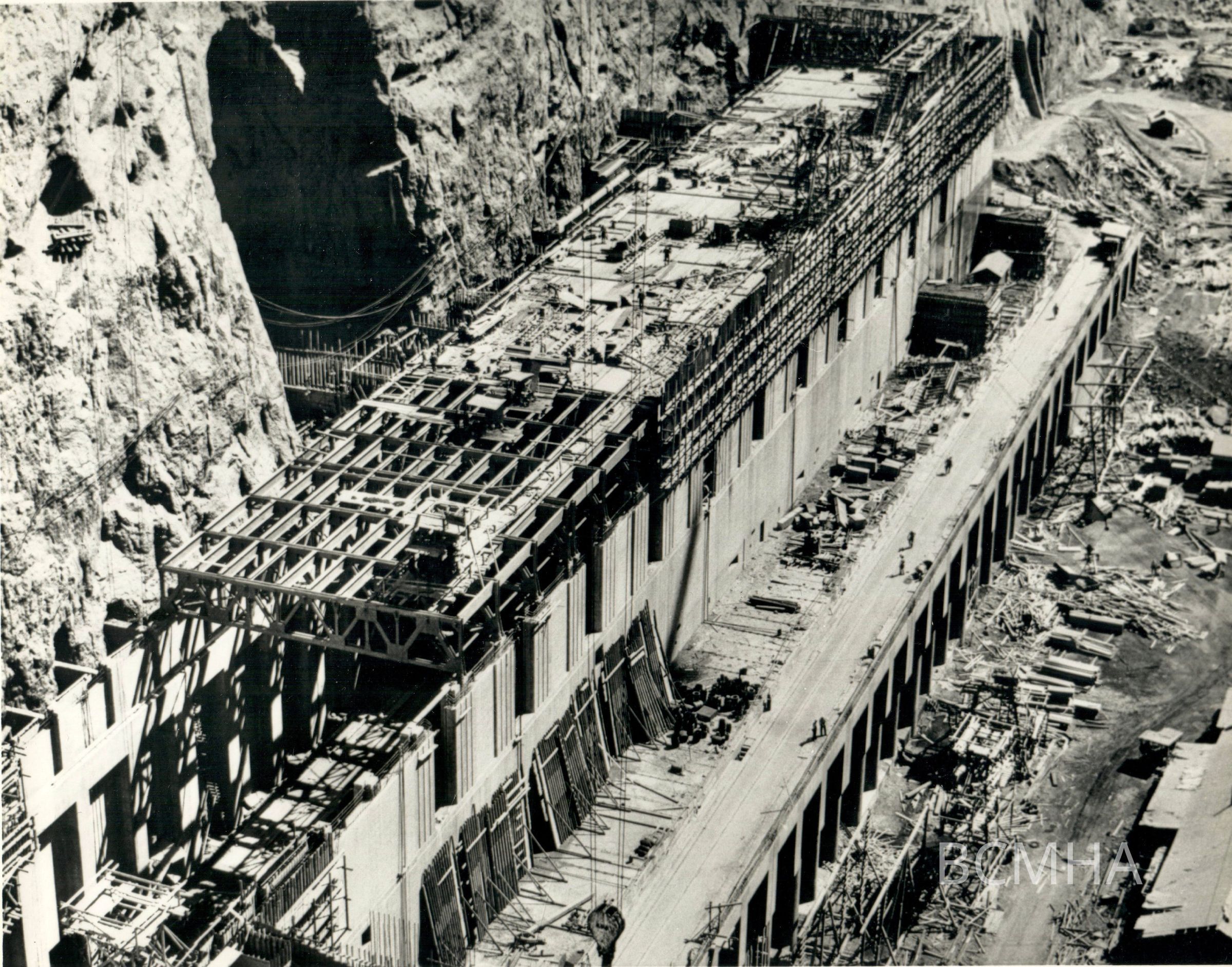 Hoover Dam construction: power generation: "Arizona wing of power plant as seen from Elevation 975 gallery at downstream face of dam." 6/3/35; B. D. Glaha, photographer; Bureau of Reclamation photo/BCP 3213A; UNLV Library - Special Collections Copy NegativeCollection