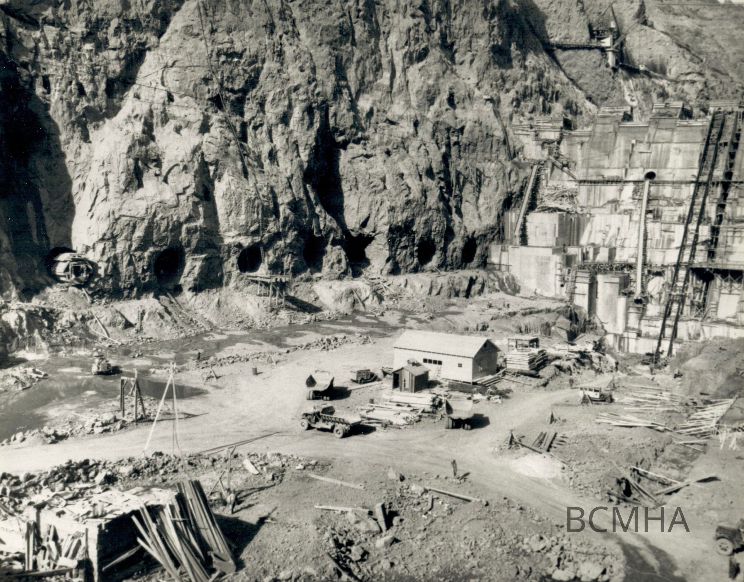 Hoover Dam - construction: power generation: "Looking upstream toward Nevada Powerhouse, showing 18-foot penstock openings." 2-20-34.; W. A. Bechtel Collection Photo #2546 - Volume Three; Roll 34 - Photo No. 5 Copy Negative - Bureau of ReclamationCollection