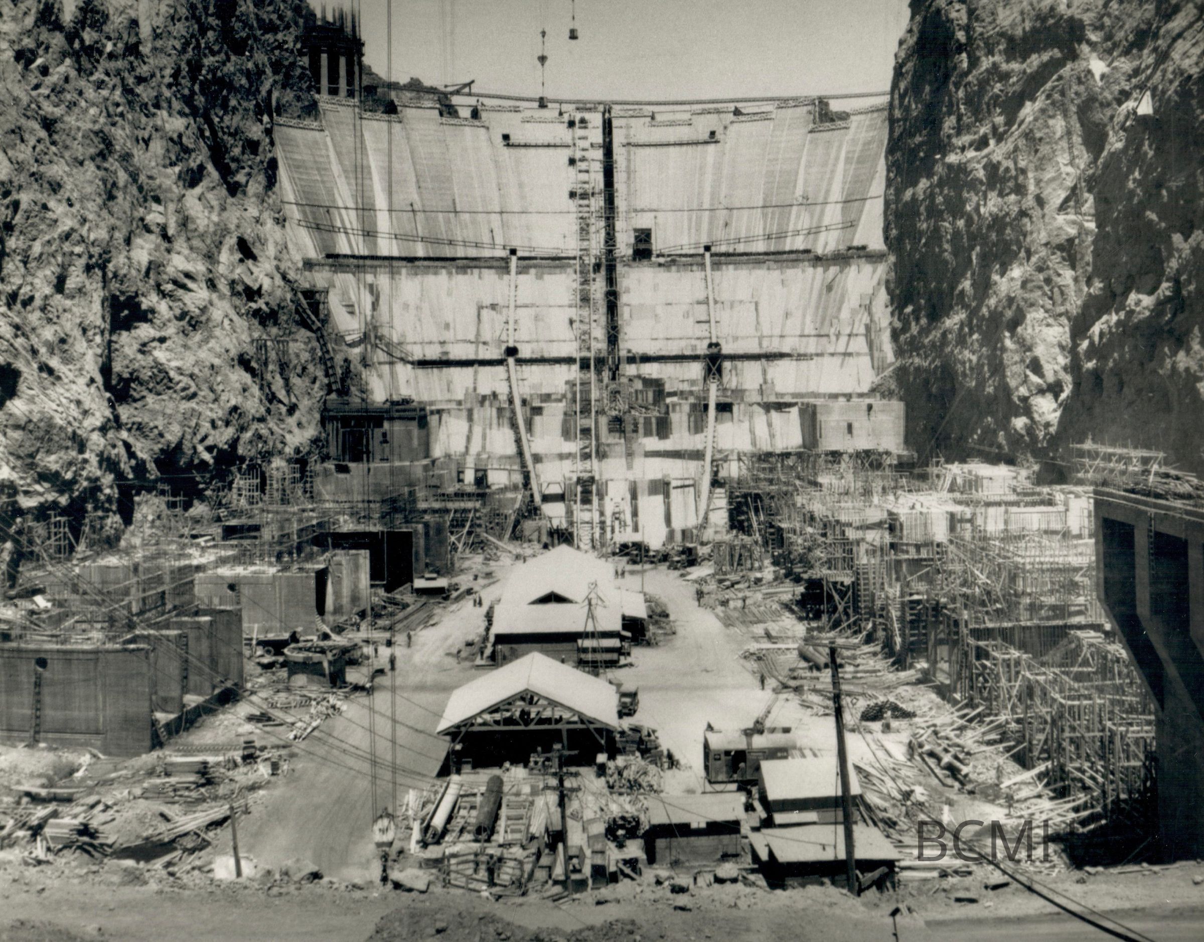 Hoover Dam construction: power generation: "Boulder Dam and Powerhouse looking upstream from the downstream cofferdam." 5-29-34; W. A. Bechtel Collection Photo #2701 - Volume Three; Roll 36 - Photo No. 8 Copy Negative - Bureau of ReclamationCollection