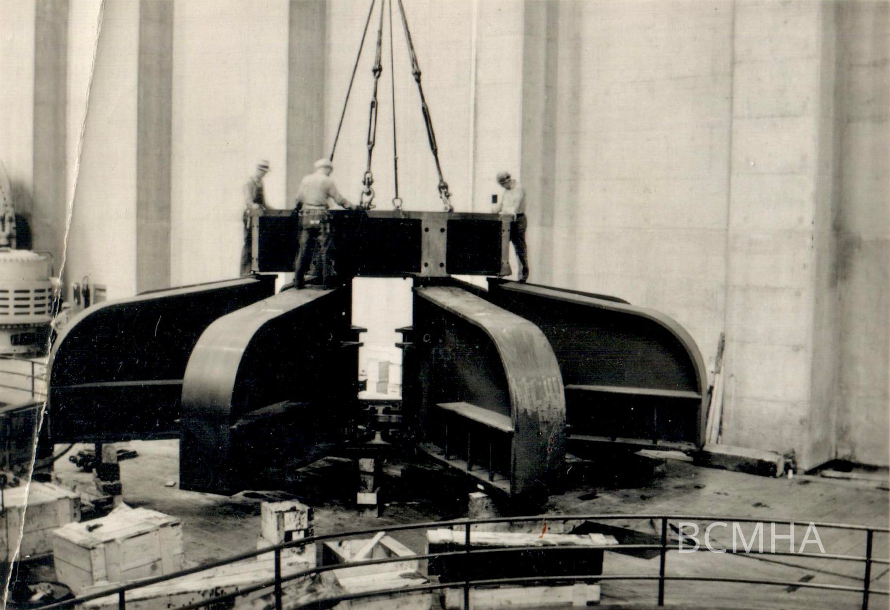 Hoover Dam construction: power generation: assembling the stator, c. 1935-37; these are the upper bearing guide brackets; Pictured: Mr. Walsh; Mr. Dickens; Mr. GravesCollection