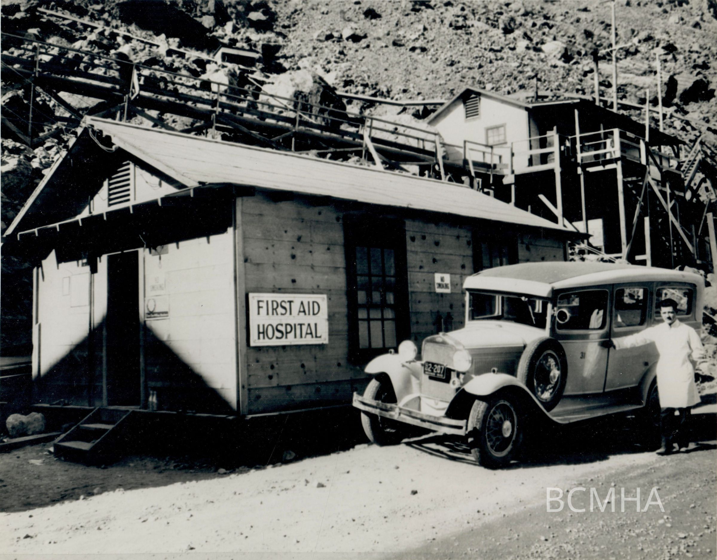 Hoover Dam construction: River Camp: "First-aid station and ambulance located at the river camp above the upper portals (the "Cliffdwellers"). A similar hospital is maintained at the lower portals." 3-8-32; W. A. Bechtel Collection Photo #969 - Volume Two] [Roll 16 - Photo No. 8 Copy Negative - Bureau of Reclamation]Collection