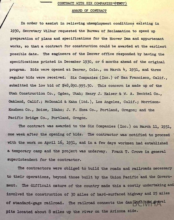 Hoover Dam - Construction: Six Companies Contract [March 11, 1931]Entry/Object ID