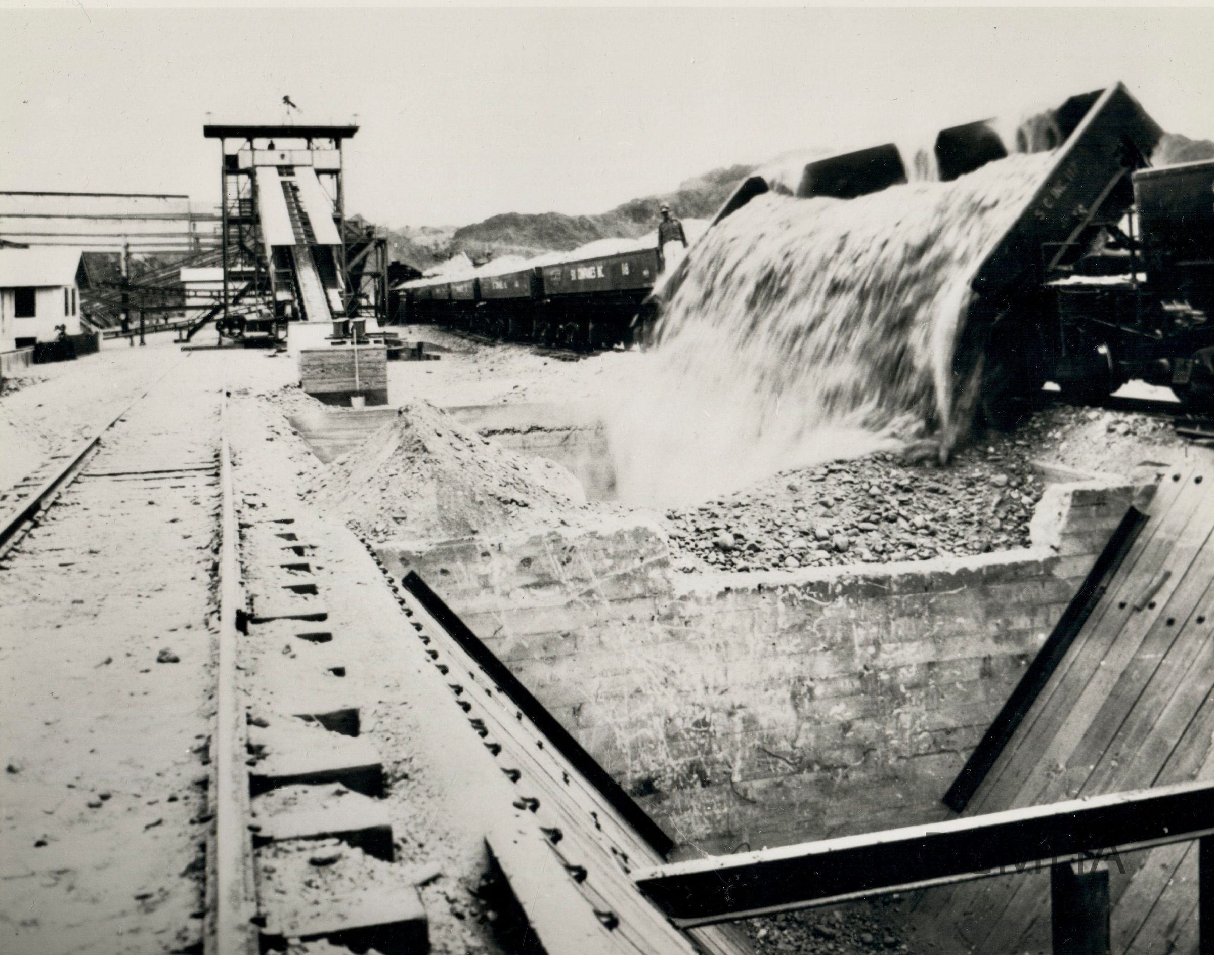 Hoover Dam construction: concrete: "Thirty cubic-yard side-dump car from the gravel pits dumping into depressed track hopper at the gravel plant. 3/19/32."; 0120 0018 folder 120 Burrell C. Lawton Collection; UNLV Library - Special Collections Copy Negative; USBR photoCollection