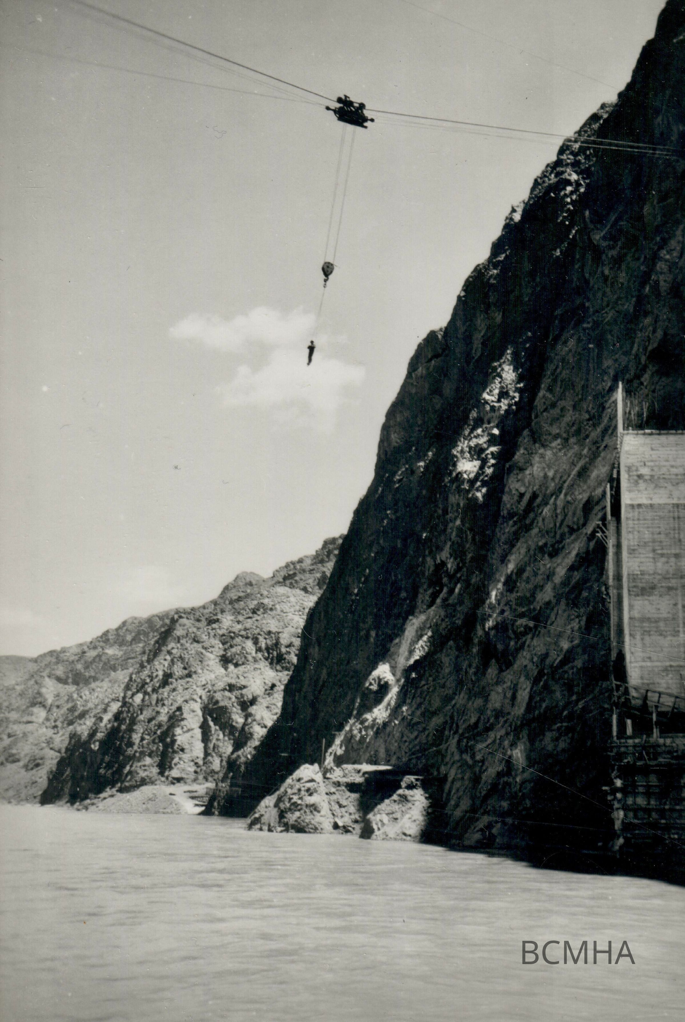 Hoover Dam construction: Worker riding a cableway line, c. 1934-1935; 0123 0107 (DOP); Ray Cutright Collection?; UNLV Library - Special Collections Copy NegativeCollection