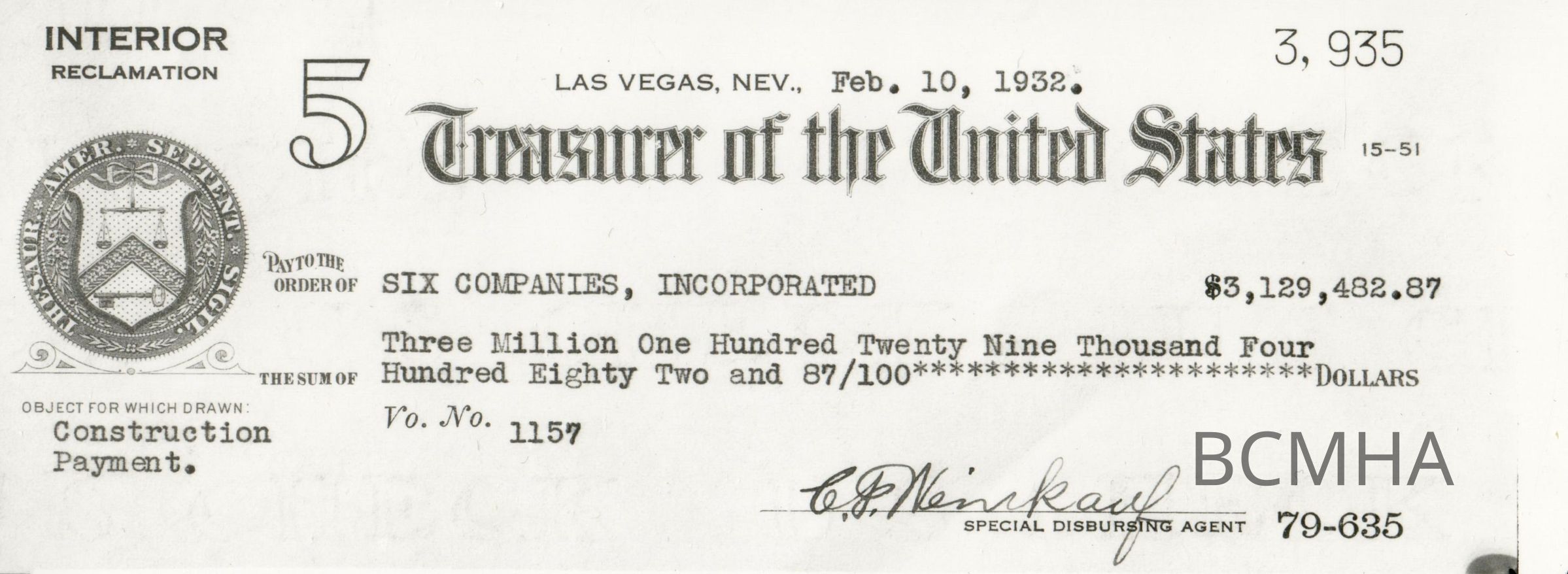 Hoover Dam construction: workers: "Check issued by special fiscal agent C. F. Weinkauf covering the January construction estimate of Six Companies, Inc." February 10, 1932; Water and Power Resources Service photo by Las Vegas Studio photographer; USBR photo/P45-301-1071Collection