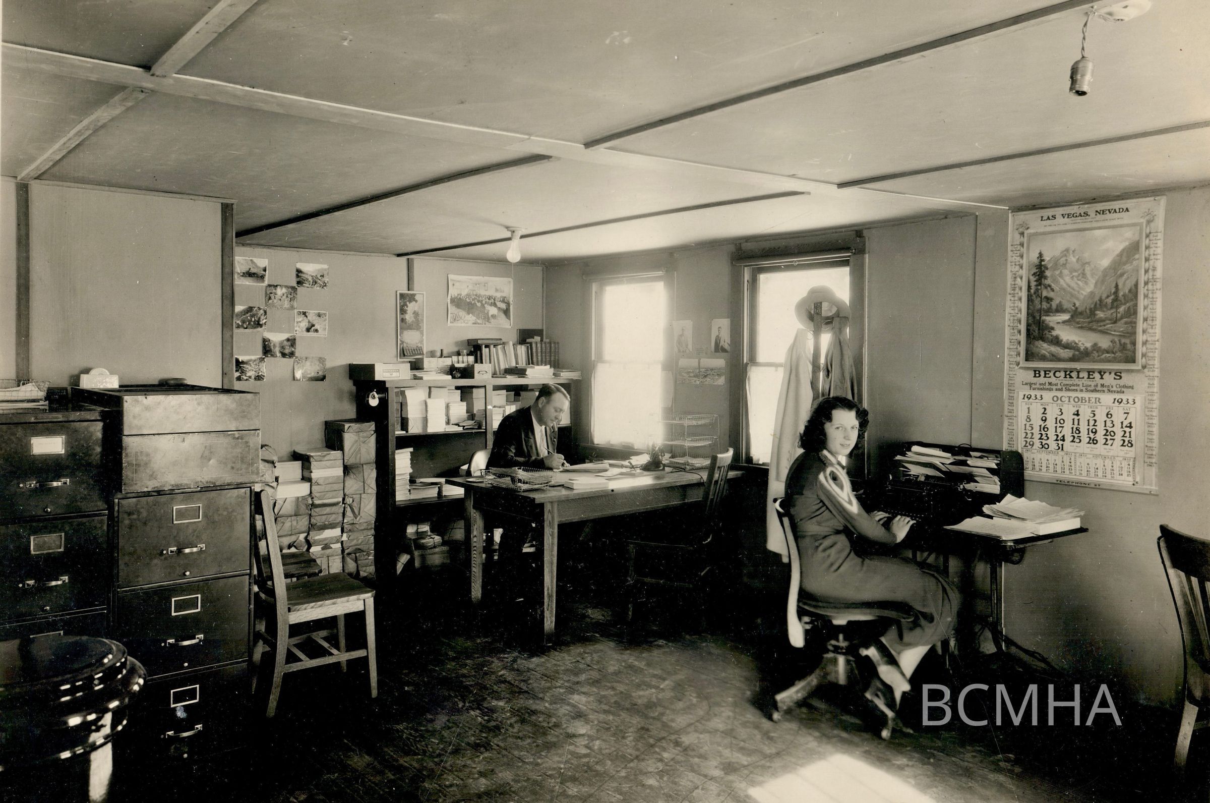 Hoover Dam construction: workers: employment office in Las Vegas, c. October 1933; l-r: Leonard Blood, hiring agent; Maxine Harrison (Riepen), clerkCollection
