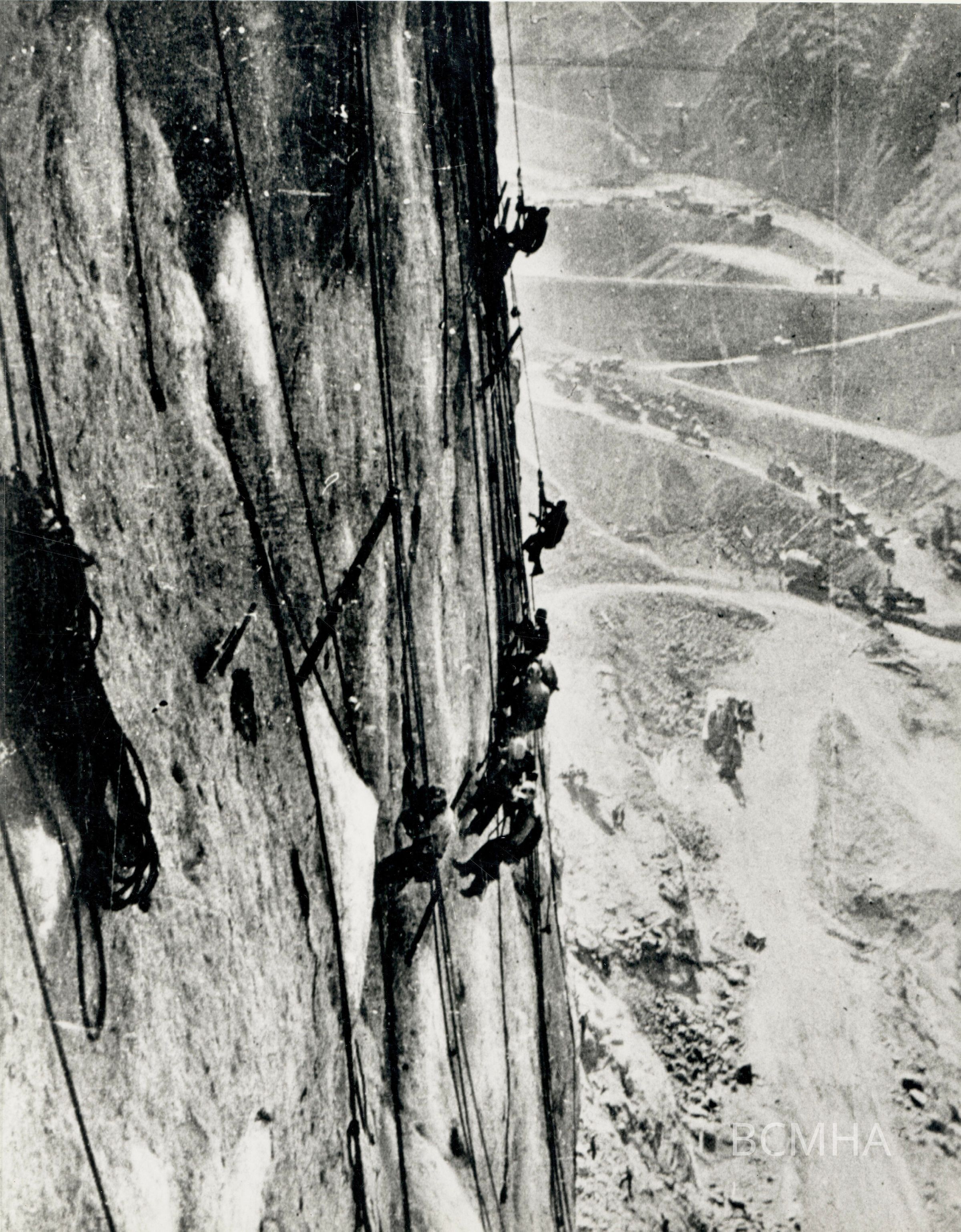 Hoover Dam - construction: workers: "High-scalers descending into canyon." ca. November 1932 - June 6, 1933; FA-39:17; Fenton-Harbor Collection; Boulder City LibraryCollection