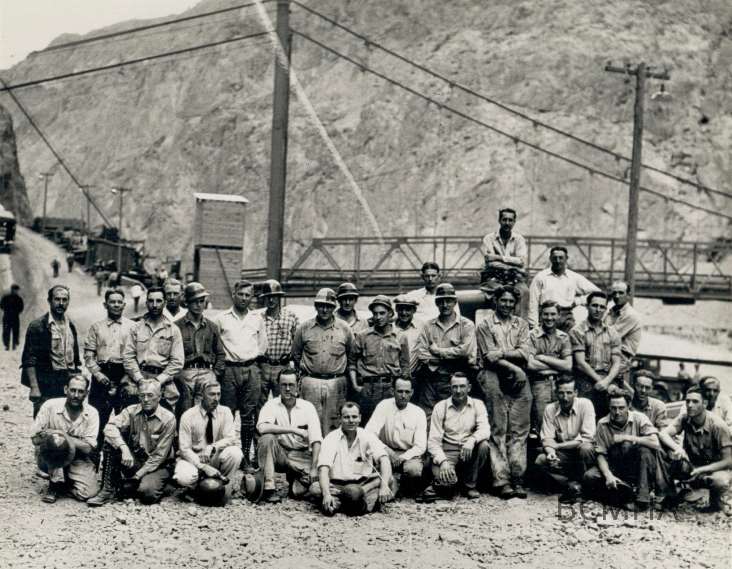 Hoover Dam construction: workers: "Group shot of workers at Hoover damsite." Circa 1931-32; Boulder City Library Association Volume I - 1922-1932; Roll 5 - Photo No. 8 Copy Negative - Bureau of ReclamationCollection