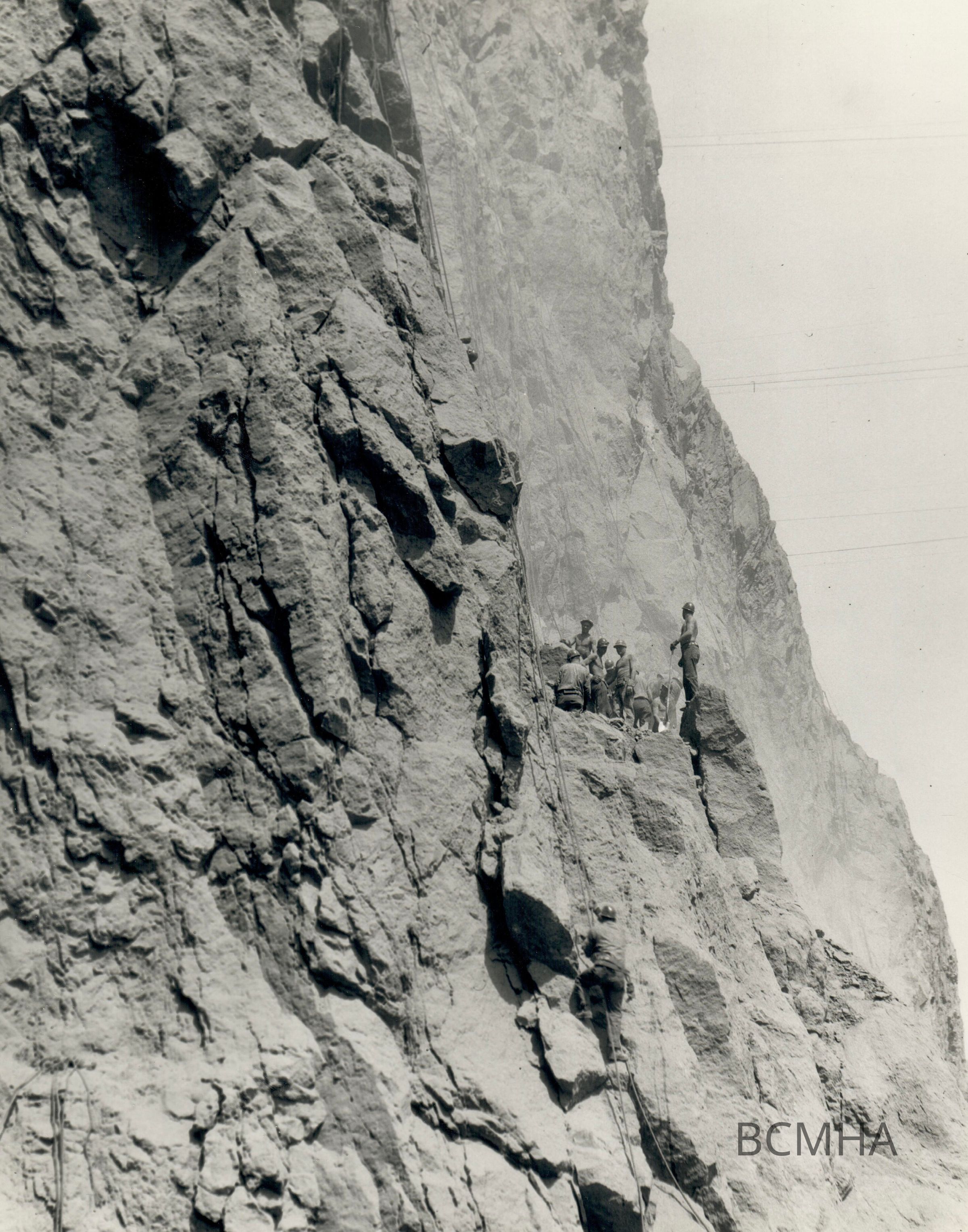 Hoover Dam construction workers: high-scalers; "Scaling crew on Nevada wall of Black Canyon above power plant location."; 4-10-33; B. D. Glaha, photographer; USBR photo/BCP 01636Collection