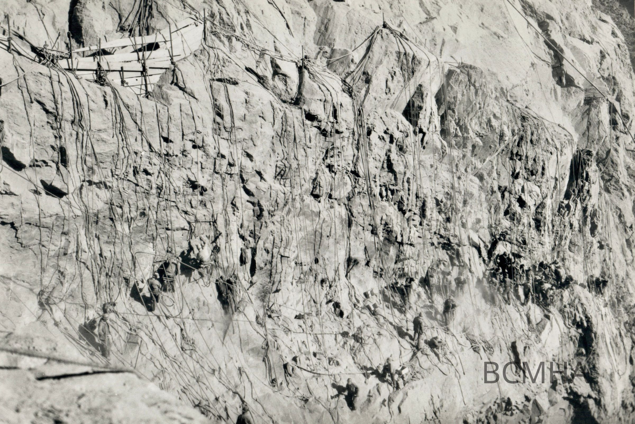 Hoover Dam construction: workers, 1932-33; "High scaling. Nevada side of the canyon; outlet works."; USBR photo; Copy Negative from Outside CollectionCollection