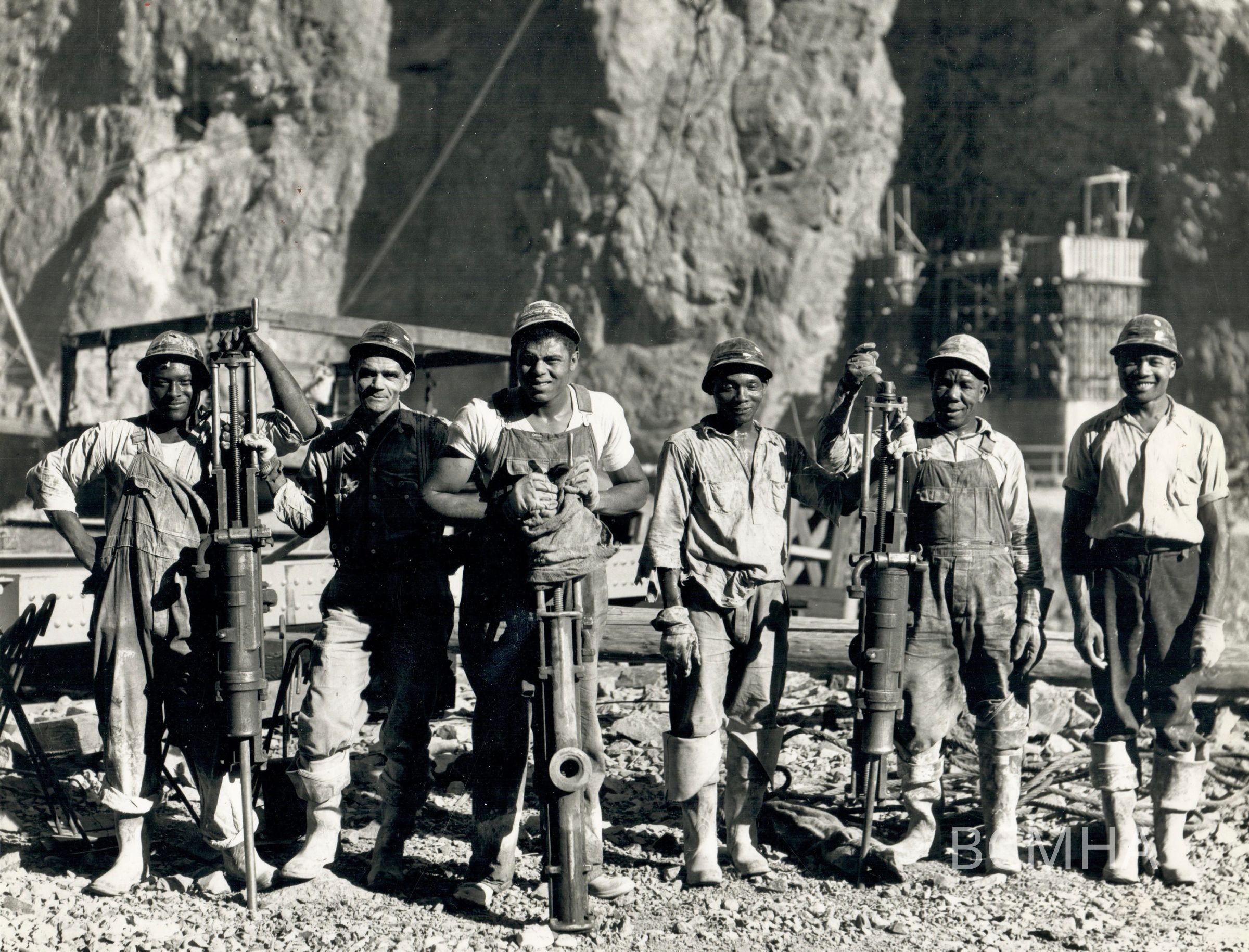 Hoover Dam - construction: workers: African-American: "Negroes employed as drillers on the construction of the Hoover Dam." October 3, 1932; Water and Power Resources Service; B. D. Glaha, photographer; USBR photo no. P45-301-1411Collection