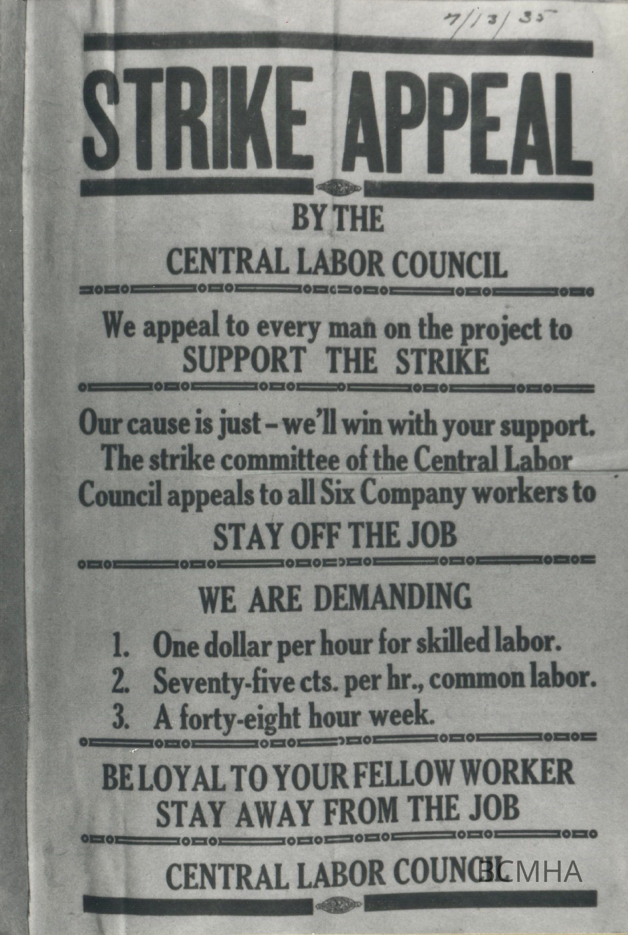 Hoover Dam - construction: workers: Labor strike, July 1935 "Strike appeal broadside [from the Frank C. "Doc" Jensen]", July 13, 1935Collection