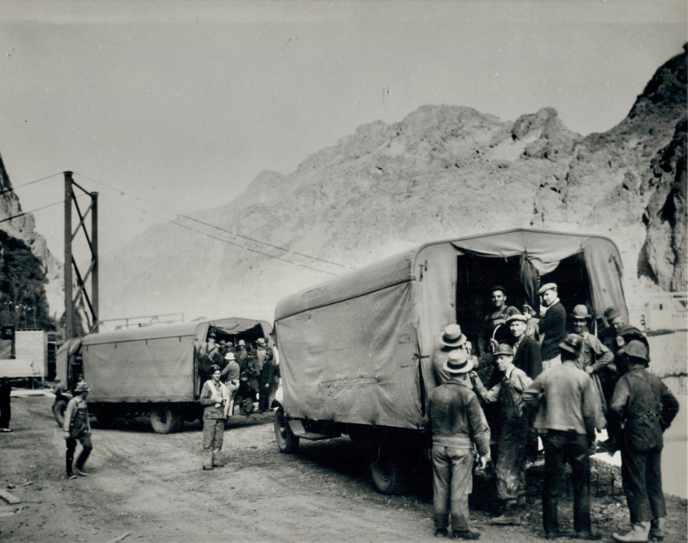 Hoover Dam - construction: workers: transportation: "Day shift workmen entering transports at the upper portal for their return journey to Boulder City, ten miles away", c. March 18, 1932; Burrell C. Lawton Outside Collection 0120-0017/Folder 120; Bureau of Reclamation photo; B. C. Lawton, photographerCollection