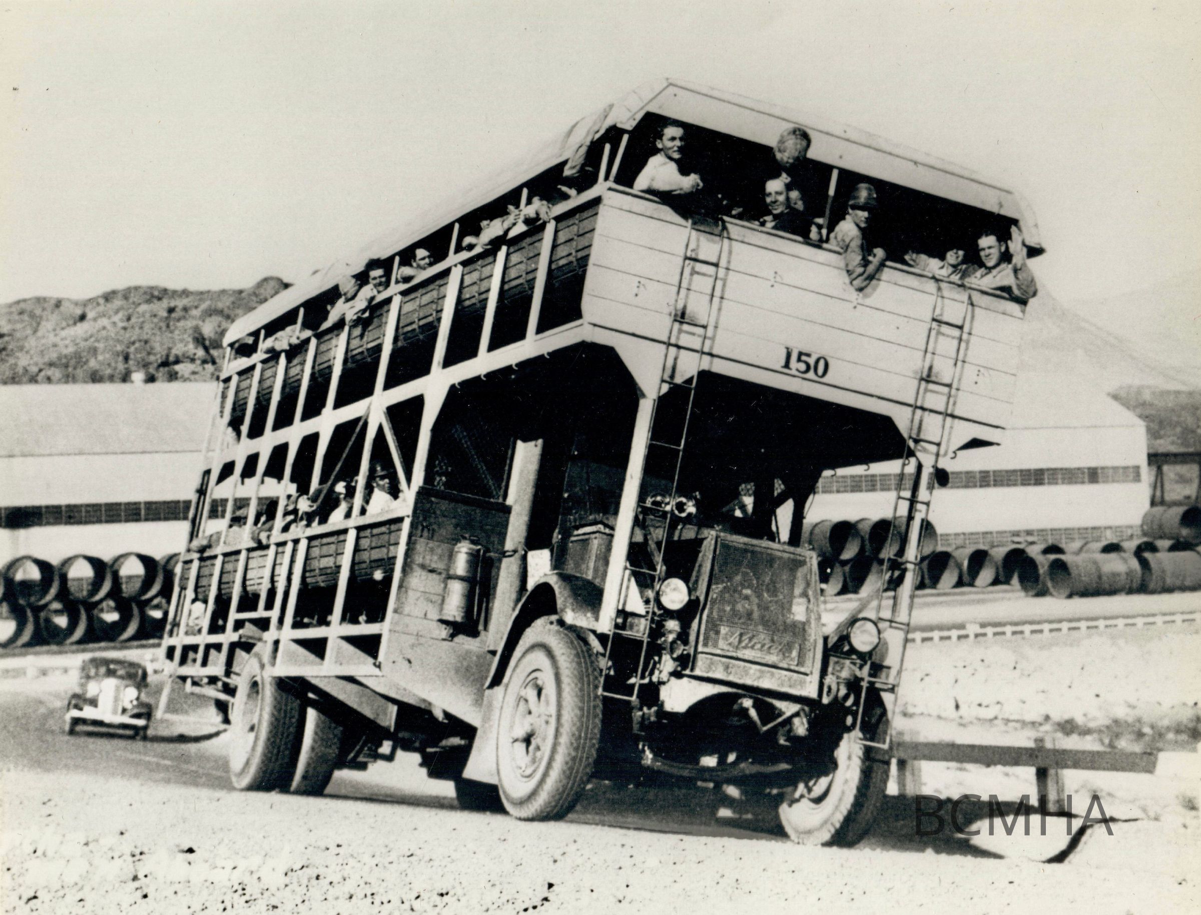Hoover Dam construction workers: transportation: "Big Bertha" - Motor transport carrying 150 men used in transporting workmen from Boulder City to the dam. 4-12-34; Bureau of Reclamation photo by B. D. Glaha; Boulder City Library Association/BCP 02394; Volume II - 1933-1939; Roll 1 - Photo No. 9 Copy Negative - Bureau of ReclamationCollection