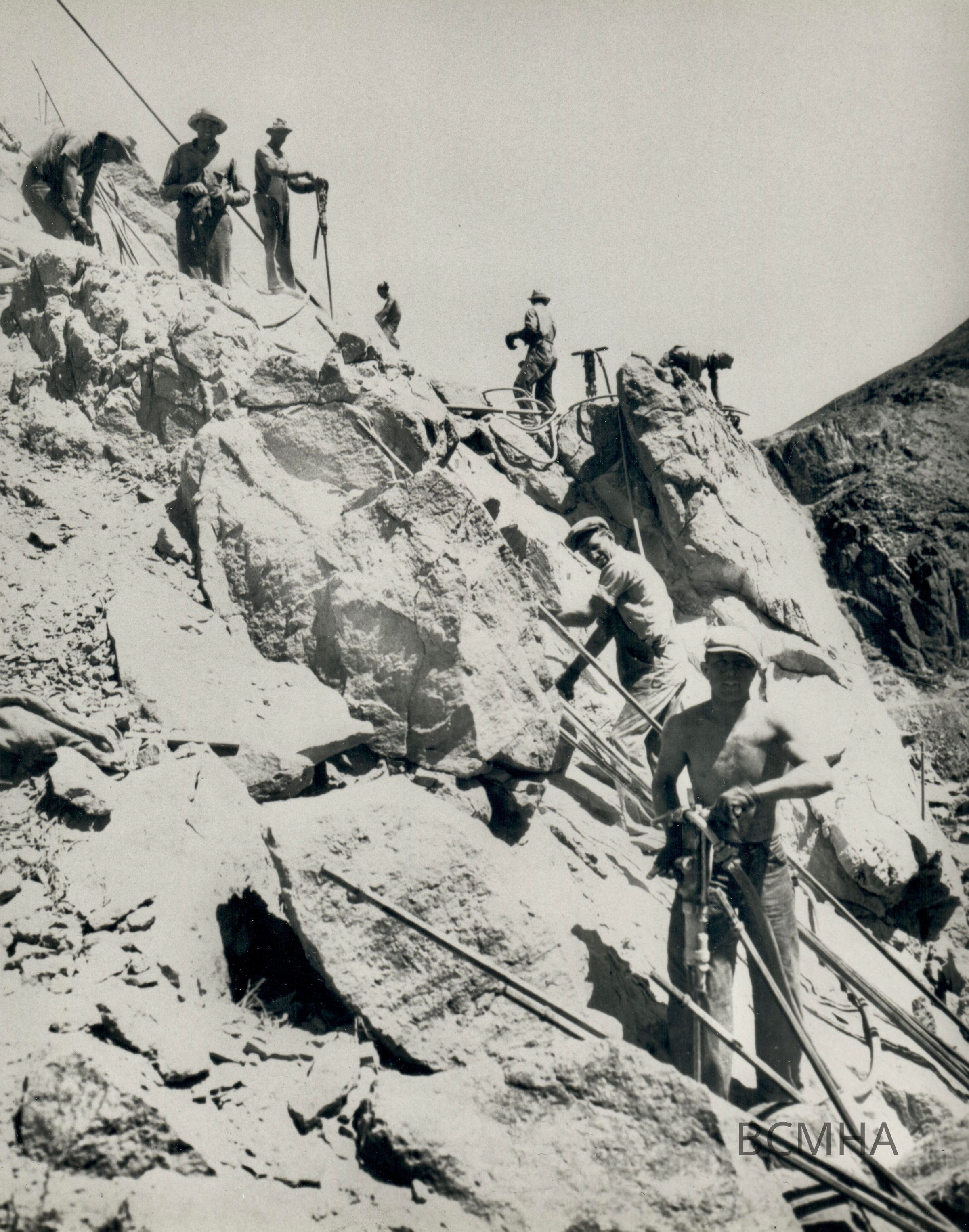 Hoover Dam construction: "Workmen loading holes with dynamite in preparation for a blast on a cableway bench extension." July 18,1932Entry/Object ID
