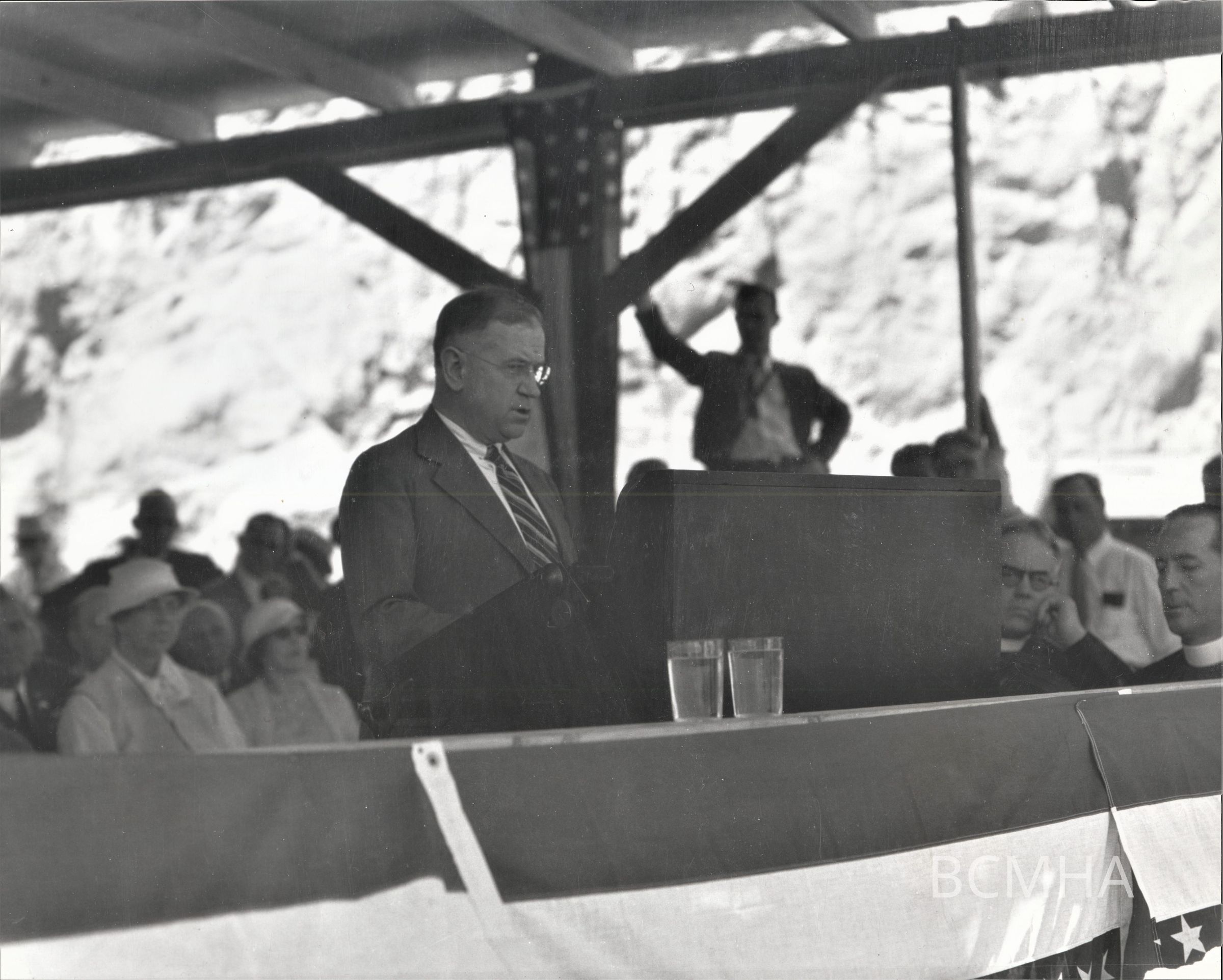 Hoover Dam dedication, September 30, 1935 [Secretary of the Interior Harold Ickes delivering an address]; USBR photo no. BCP 03279; Bernard D. "Ben" Glaha, photographerCollection