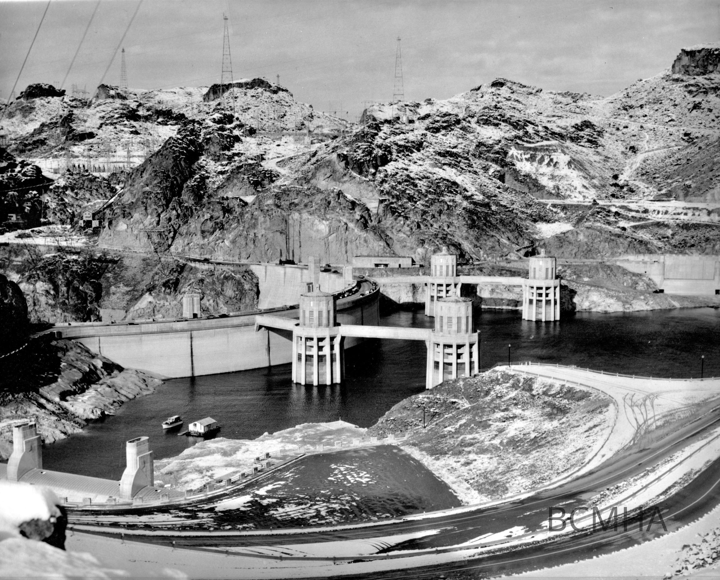 Hoover Dam general view, 1940's [snow]; USBR photo/BCP-7137Collection
