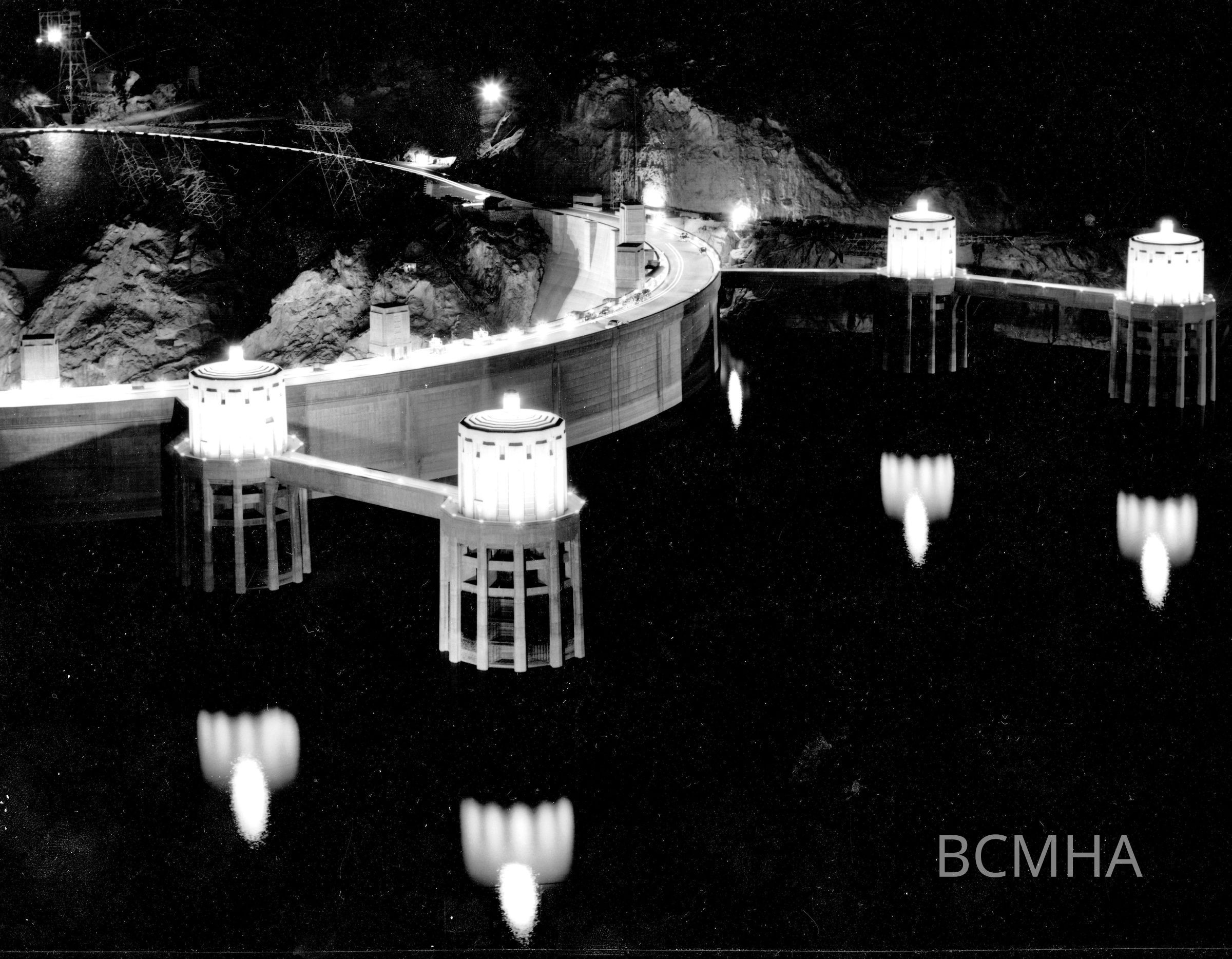 Hoover Dam general view [night shot], c. 1930's-1940's: "The intake towers of the Boulder Dam are reflected like giant candles by the rising waters of Lake Mead." May 17, 1940; Cliff Segerblom, photographer; USBR photo/P45-301-5052Collection