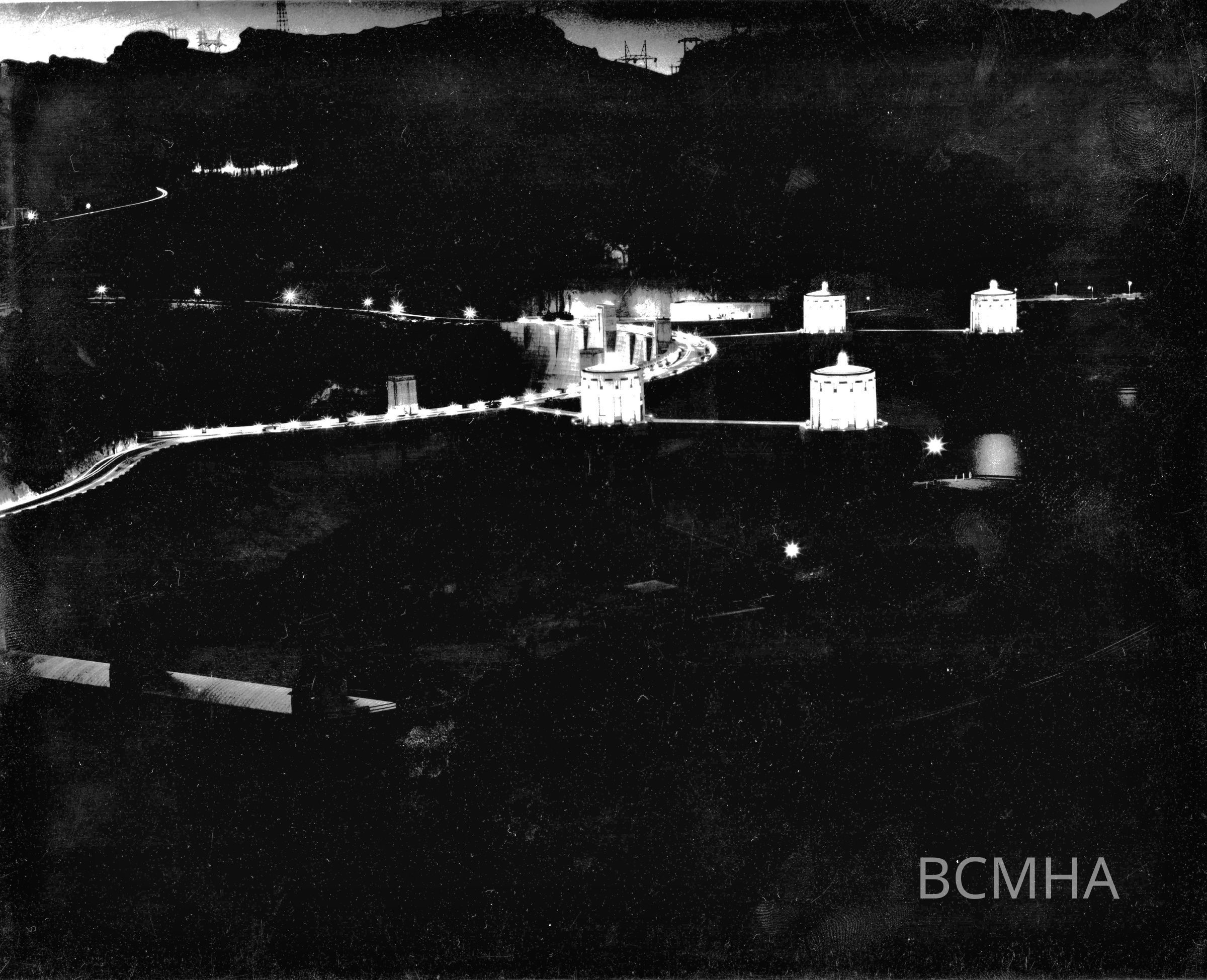 Hoover Dam - general view, c. 1930's-1940's [night shot]; USBR photo/BCP-8068Collection