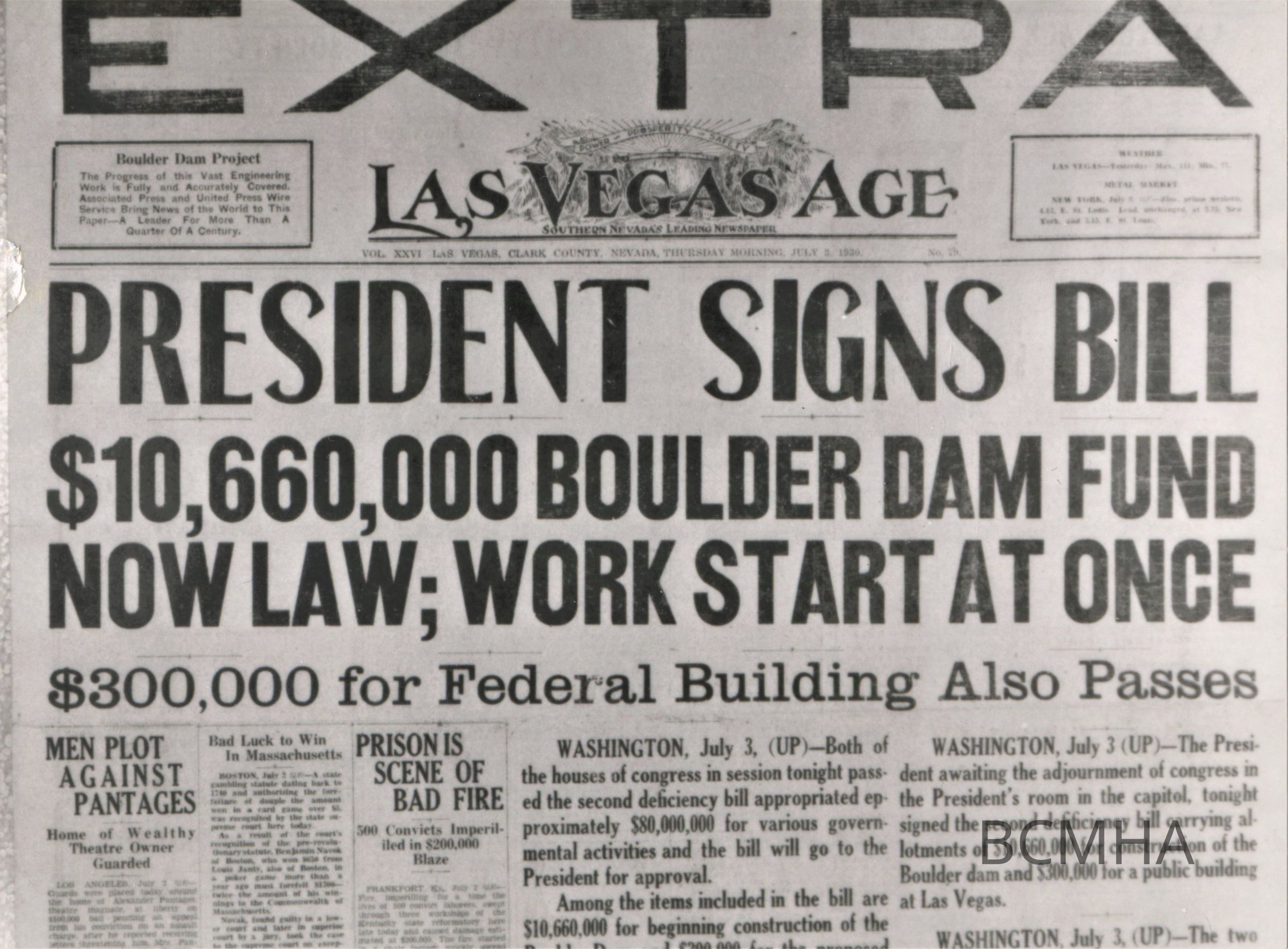 Hoover Dam; headline; "President Signs Bill "; appropriations; Las Vegas Age extra; July 3, 1930; p.1Collection