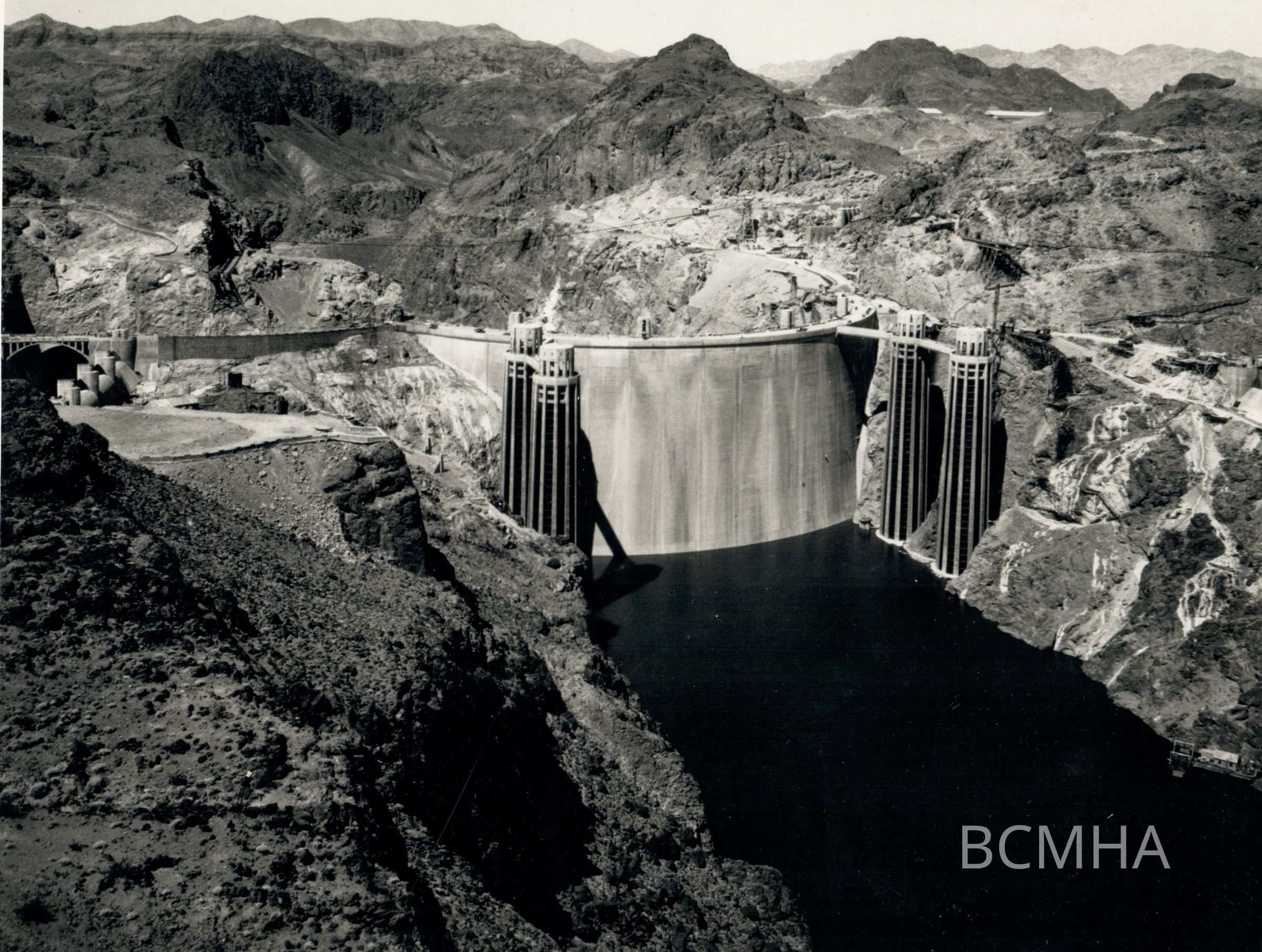 Hoover Dam - "Looking downstream from the Arizona side of the Black Canyon showing the reservoir level at the base of the intake towers." 6-24-35; W. A. Bechtel Collection Photo #3321 - Volume Three; Roll 44 - Photo No. 2 Copy Negative - Bureau of ReclamationCollection