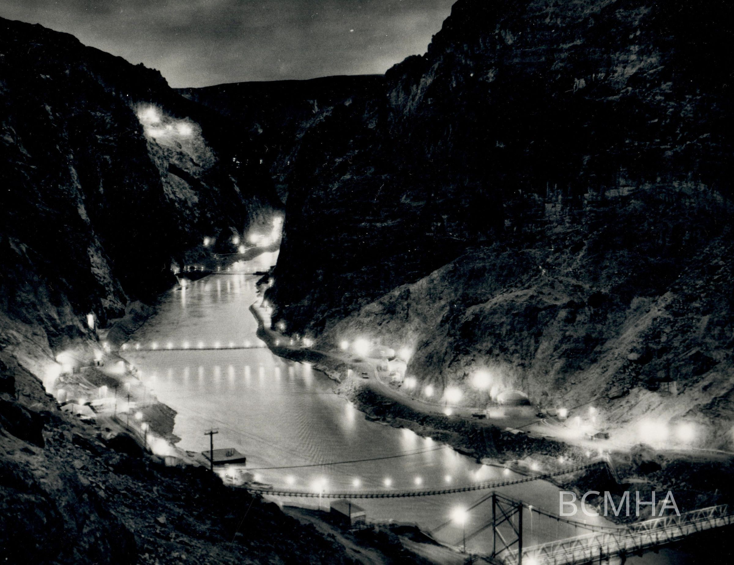 Hoover Dam - "Night view, looking upstream from below the lower portals of the diversion tunnels. The canyon presents a spectacular sight at night with its myriad of lights." 4-8-32; W. A. Bechtel Collection Photo #1113 - Volume Two; Roll 17 - Photo No. 9 Copy Negative - Bureau of ReclamationCollection