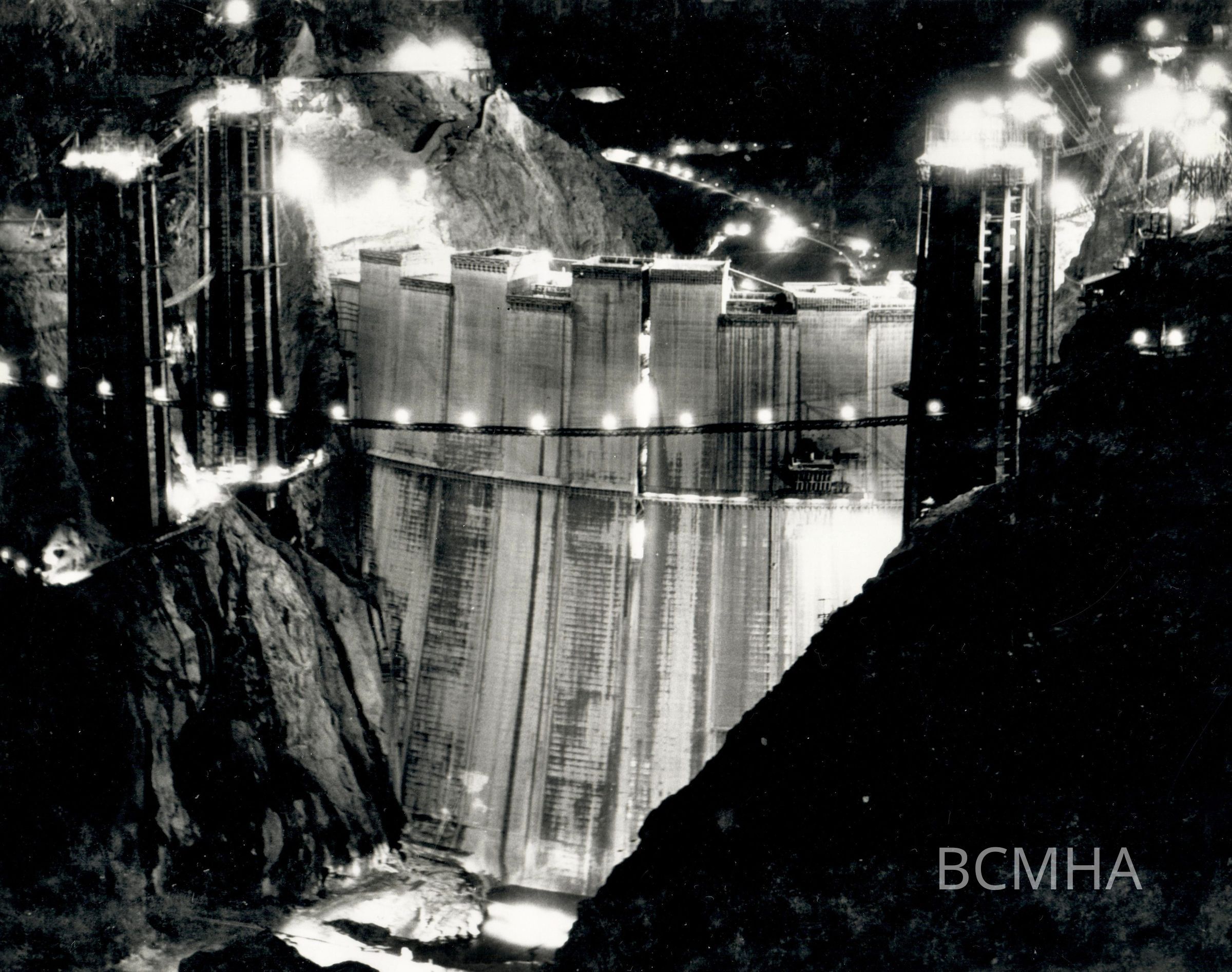 Hoover Dam - "Night view of the upstream face of the dam and appurtenant work as seen from high point upstream on the Nevada rim of Black Canyon. October 20, 1934."; B. D. Glaha, photographer; USBR photo Wash. No. 2692/Temp. No. 2183Collection