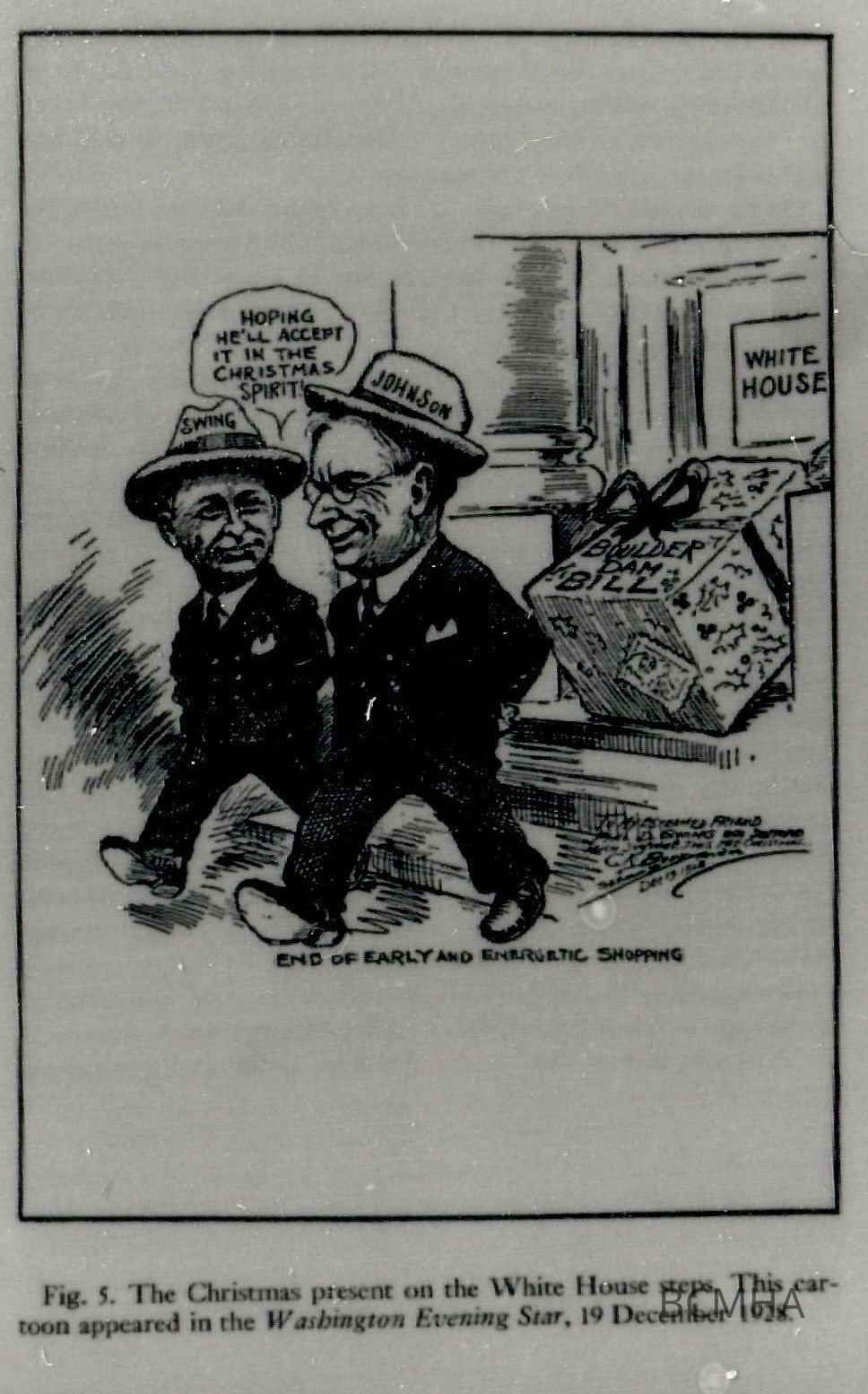 Hoover Dam Political cartoon ["The Christmas present on the White House steps" (Caricatures of Phil Swing and Hiram Johnson; from the Washington Evening Star, December 19, 1928; and appears in Phil Swing and Boulder Dam, by Beverly Moeller p. 121)]Collection